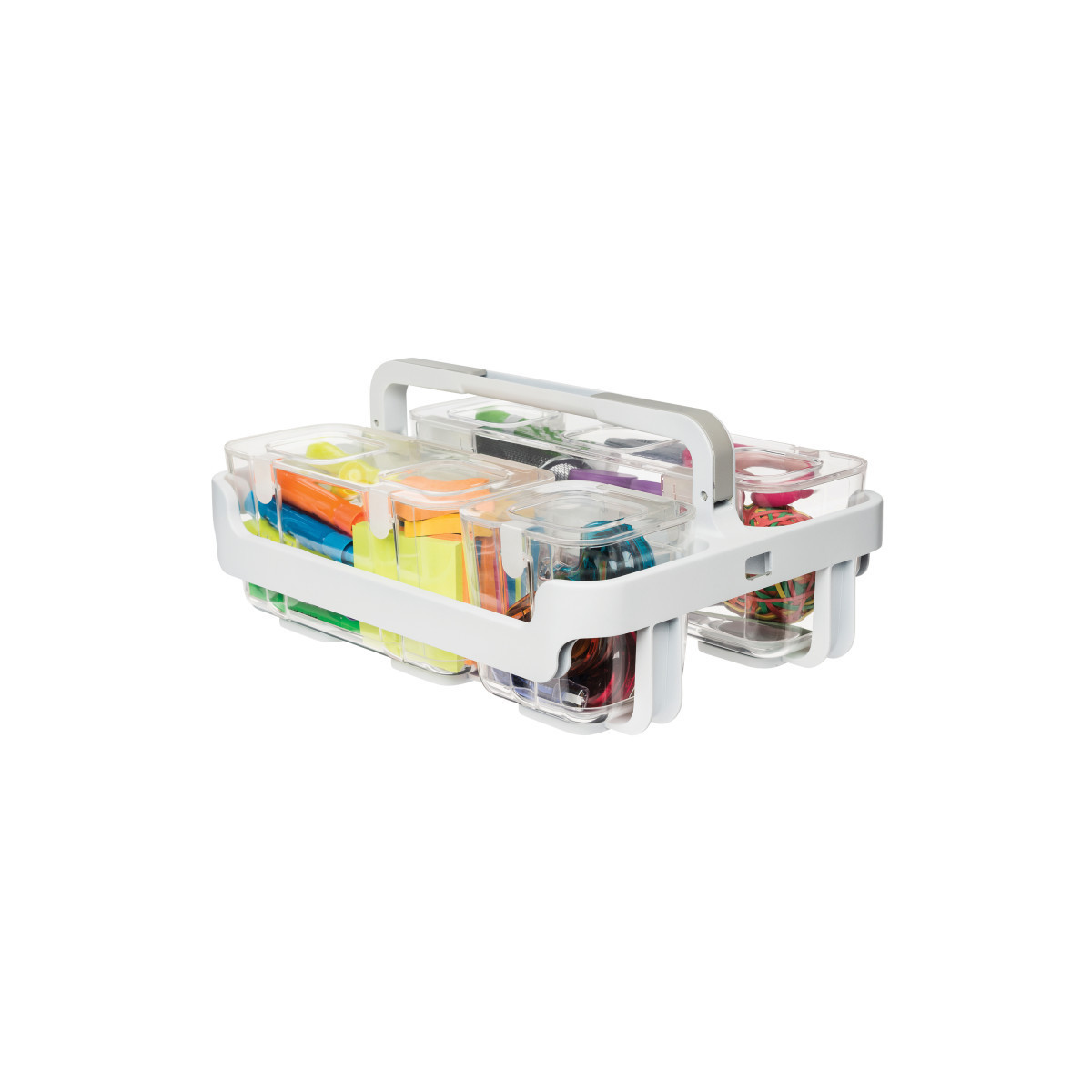 Stack and carry multiple storage caddies with the "lift & lock" tabs