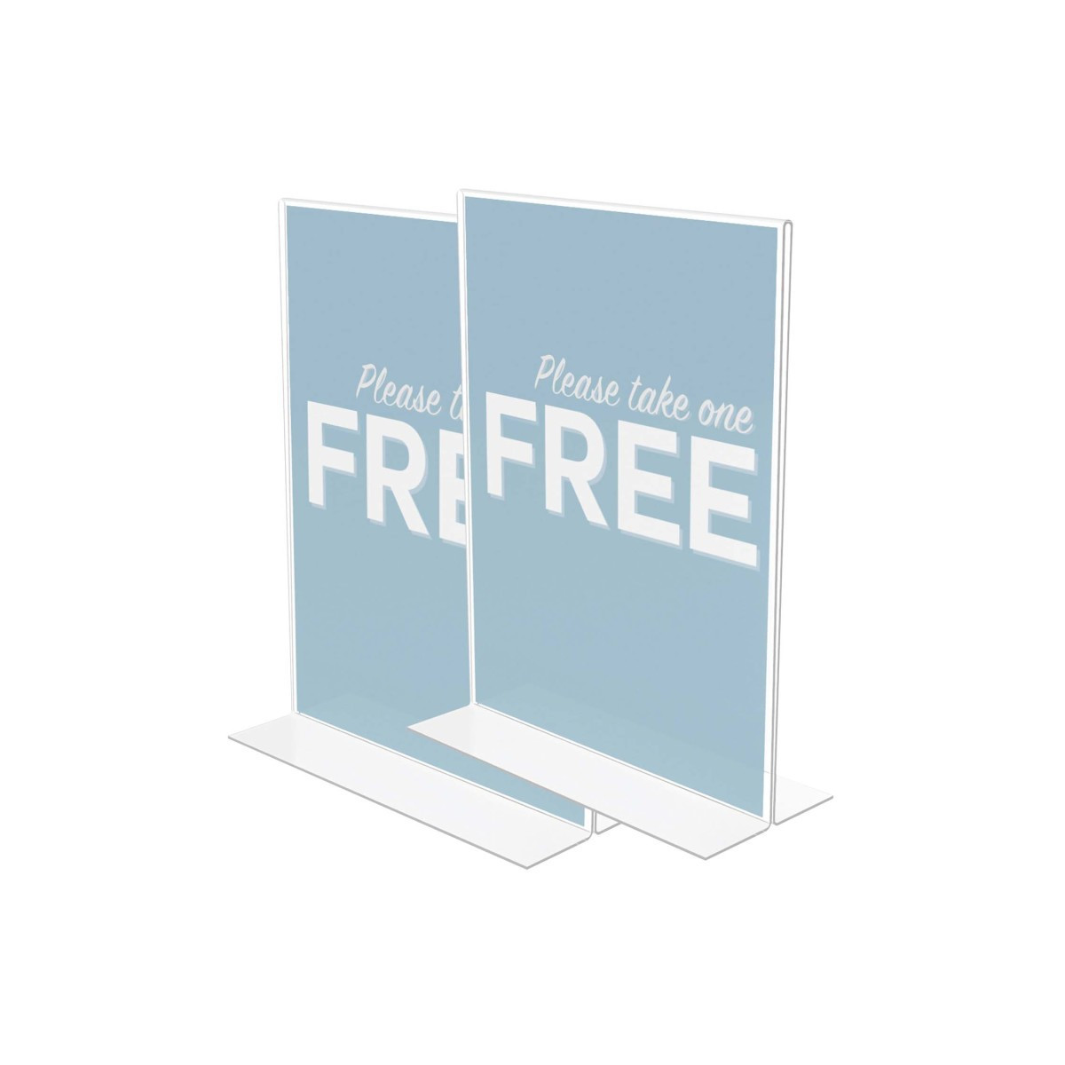 Value priced light duty freestanding plastic T-frame sign holder lets you display signs where you need them most. Two sided for double the impact. Bottom loading. Use on counter or desk. Literature slides in from the bottom. Pack of 2 sign holders.