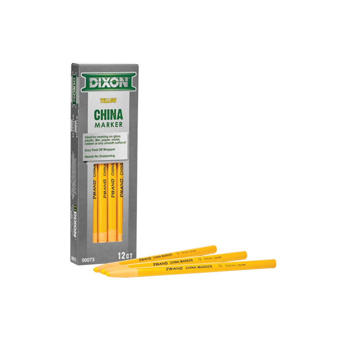 Phano china markers provide bold marks on glass, plastic, film, paper, metal, rubber, tile and more. Marks will wipe clean from non-porous surfaces. Each marker is paper wrapped with tear string for easy sharpening. Pack of 12.