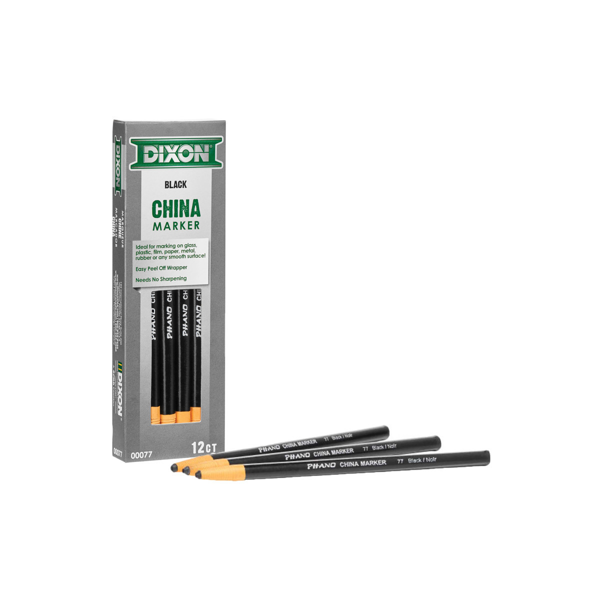 Phano china markers provide bold marks on glass, plastic, film, paper, metal, rubber, tile and more. Marks will wipe clean from non-porous surfaces. Each marker is paper wrapped with tear string for easy sharpening. Pack of 12.