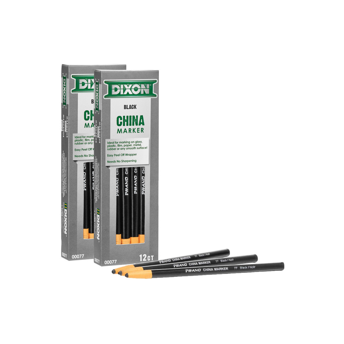 Phano china markers provide bold marks on glass, plastic, film, paper, metal, rubber, tile and more. Marks will wipe clean from non-porous surfaces. Each marker is paper wrapped with tear string for easy sharpening. Each pack includes 12 markers. Sold as 2 packs for a total of 24 markers.