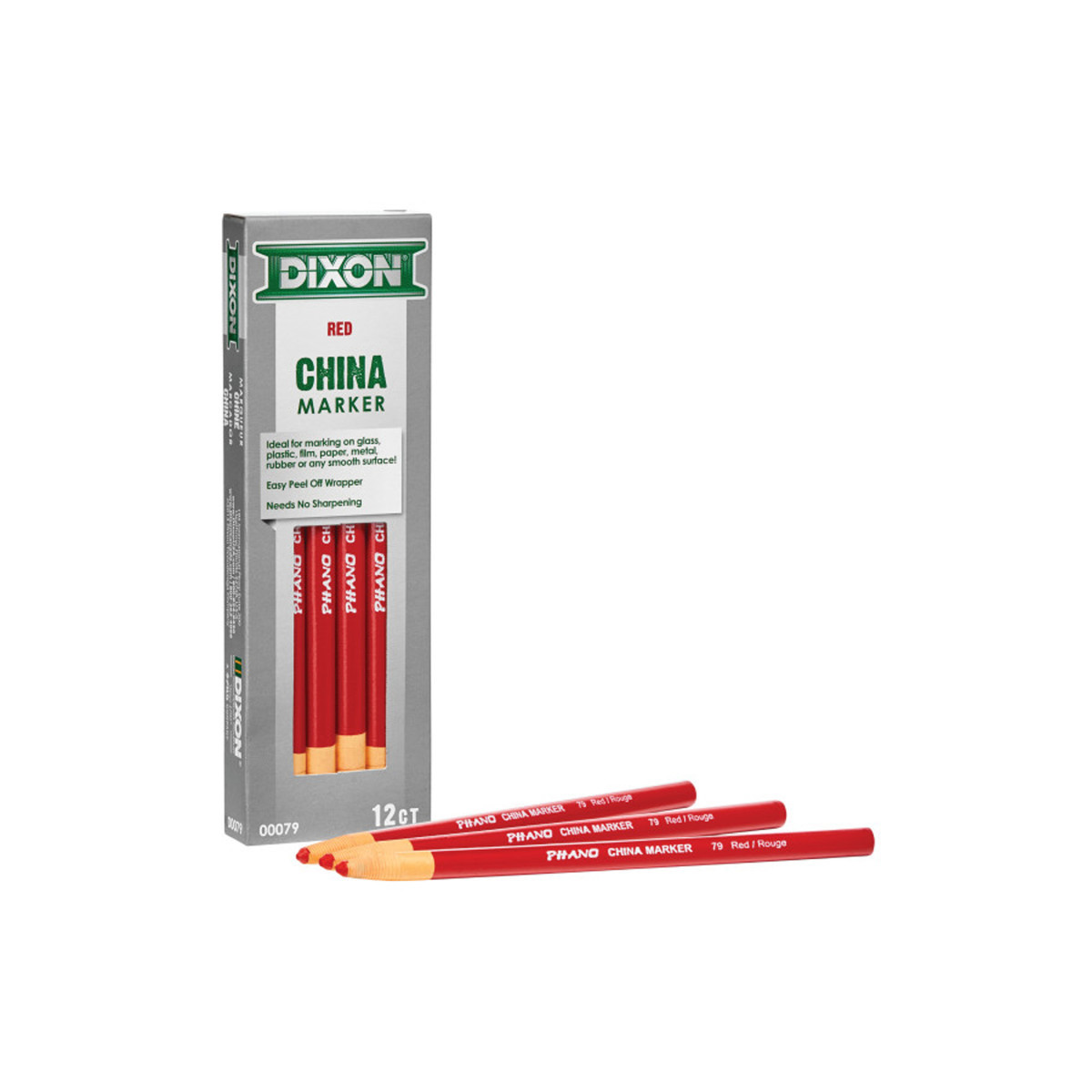 Phano china markers provide bold marks on glass, plastic, film, paper, metal, rubber, tile and more. Marks will wipe clean from non-porous surfaces. Each marker is paper wrapped with tear string for easy sharpening. Pack of 12.