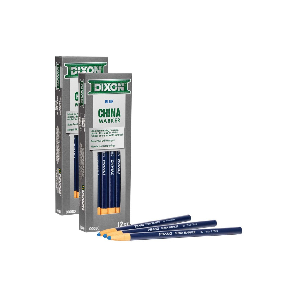 Phano china markers provide bold marks on glass, plastic, film, paper, metal, rubber, tile and more. Marks will wipe clean from non-porous surfaces. Each marker is paper wrapped with tear string for easy sharpening. Each pack includes 12 markers. Sold as 2 packs for a total of 24 markers.
