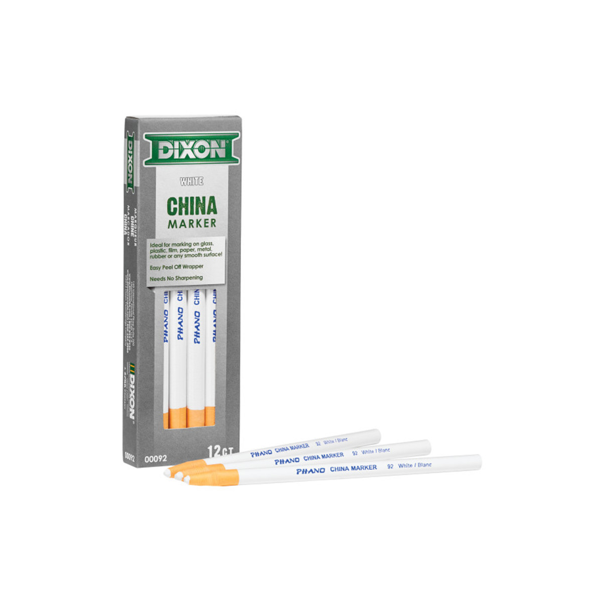 Phano china markers provide bold marks on glass, plastic, film, paper, metal, rubber, tile and more. Marks will wipe clean from non-porous surfaces. Each marker is paper wrapped with tear string for easy sharpening. Pack of 12.
