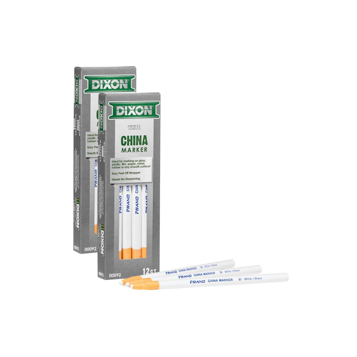 Phano china markers provide bold marks on glass, plastic, film, paper, metal, rubber, tile and more. Marks will wipe clean from non-porous surfaces. Each marker is paper wrapped with tear string for easy sharpening. Each pack includes 12 markers. Sold as 2 packs for a total of 24 markers.
