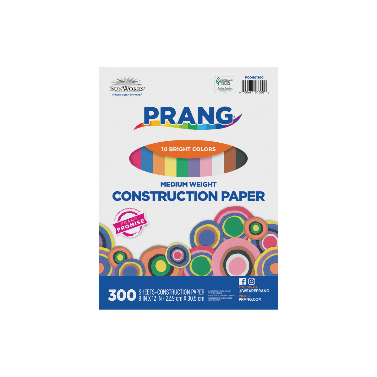 Prang® Medium Weight Groundwood Construction Paper provides the best value in school grade construction paper. It is the perfect solution for school projects and other arts and crafts. It has bright and consistent colors, is slightly textured and cuts and folds evenly without cracking. This 10 color assortment includes Scarlet, Black, Yellow-Orange, Brown, Pink, Violet, Blue, Holiday Green, White, and Yellow. Recyclable. Measures 9" x 12". Each pack includes 300 sheets.