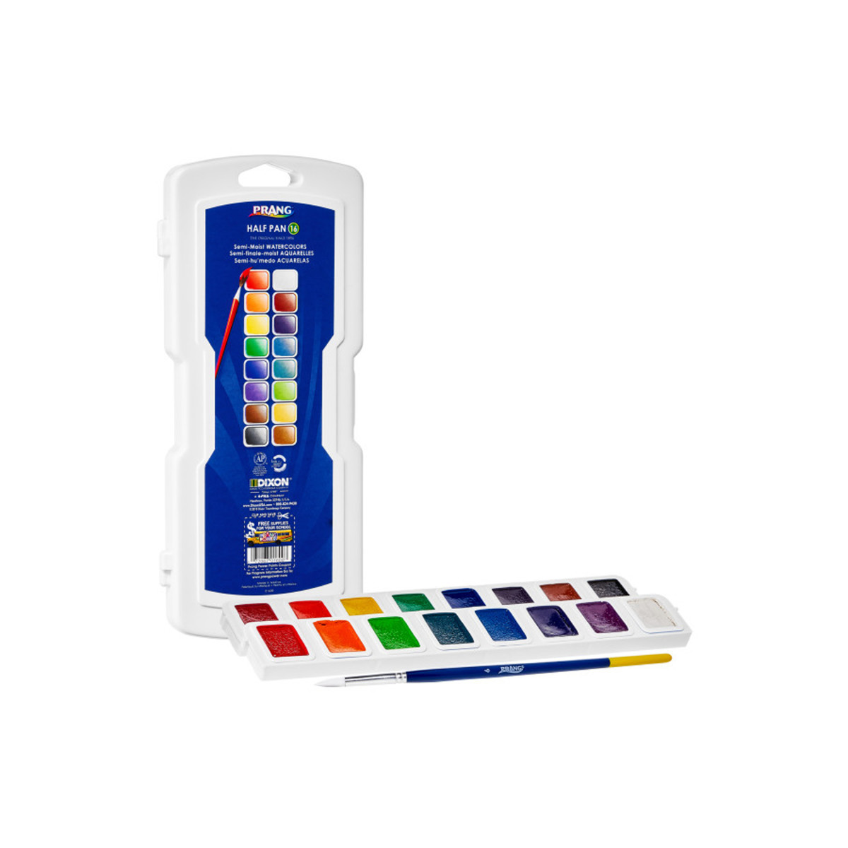 Prang watercolor half pan set are semi-moist watercolors with intense wax free pigments. You will experience a smooth laydown of brilliant colors with limitless textures. The easy snap-in refill pans help you match your preferred colors more economically. This watercolor set includes 16 brilliant colors and a strong white case with built-in mixing areas along with a top quality paintbrush. AP certified non-toxic.