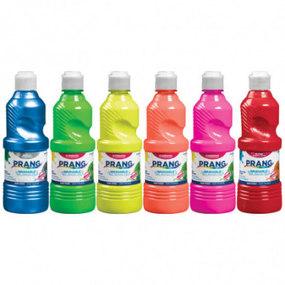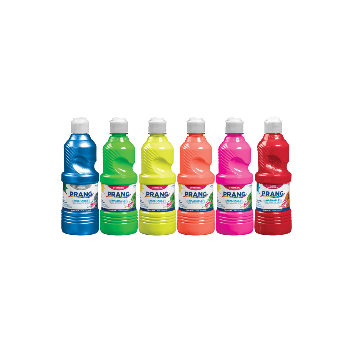 Prang ready-to-use metallic paint is a safe non-toxic formula that makes this the teacher's choice for young artists. No need to stir or shake thanks to the non-settling formula. This ultra washable version easily washes off hands and most clothing for a hassle free painting experience in the classroom or at home. Each color comes in an easy-to-pour 8 ounce bottle. Six colors include neon green, pink, neon orange, neon yellow, metallic turquoise blue, and glitter red.