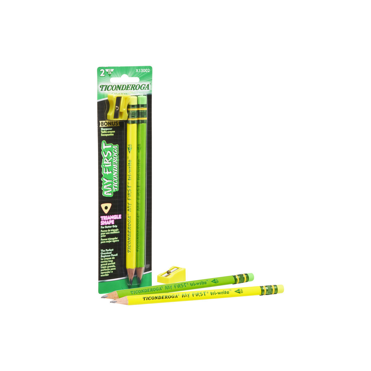 The Ticonderoga® beginner pencil that teachers and parents love in bright neon colors with a free sharpener! This triangular shaped, over sized pencil is ideal for children in the early stages of their writing development. The large size (13/32") is easy for small hands to hold while the naturally ergonomic, triangular shape helps teach correct pencil grip. Matching neon latex-free erasers. The thick graphite #2 core delivers a broad smooth line. Premium wood harvested from responsibly managed sources provides smooth, even sharpening with minimal breakage. Teachers prefer Ticonderoga® for its dependability and craftsmanship. Each pack includes 2 pencils in assorted neon colors (no color choice).