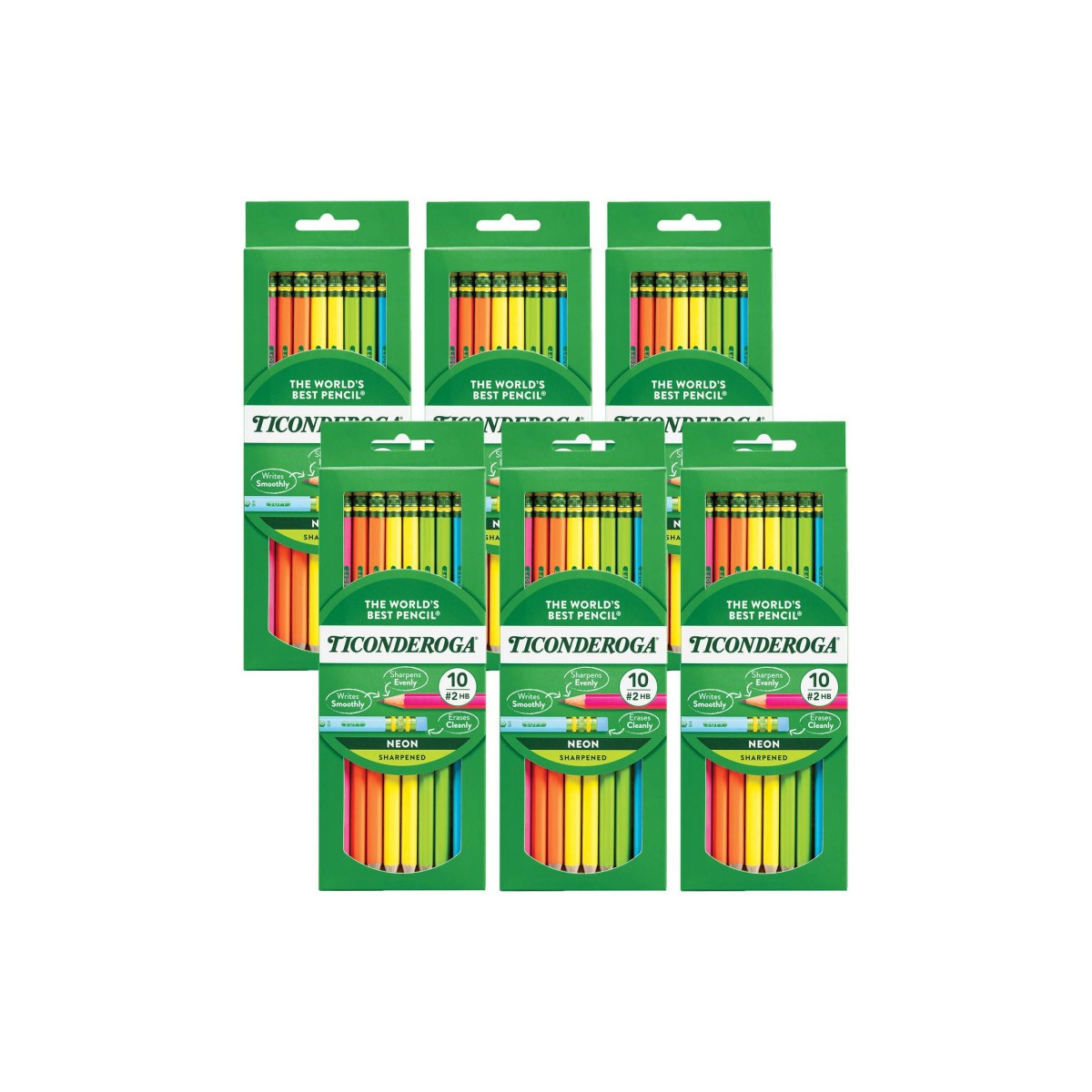 The Ticonderoga is the world's best pencil. Satin smooth finish enhances writing comfort. Exclusive graphite core formula gives you extra smooth performance. Crafted from premium, sustained yield wood. Top quality, latex-free eraser provides easy, clean corrections. Five Neon Colors: Purple, Pink, Orange, Yellow, Green. Presharpened. PEFC Certified Wood. PMA Certified Non-toxic. Each pack contains 10 pencils. Sold as 6 packs for 60 pencils total.