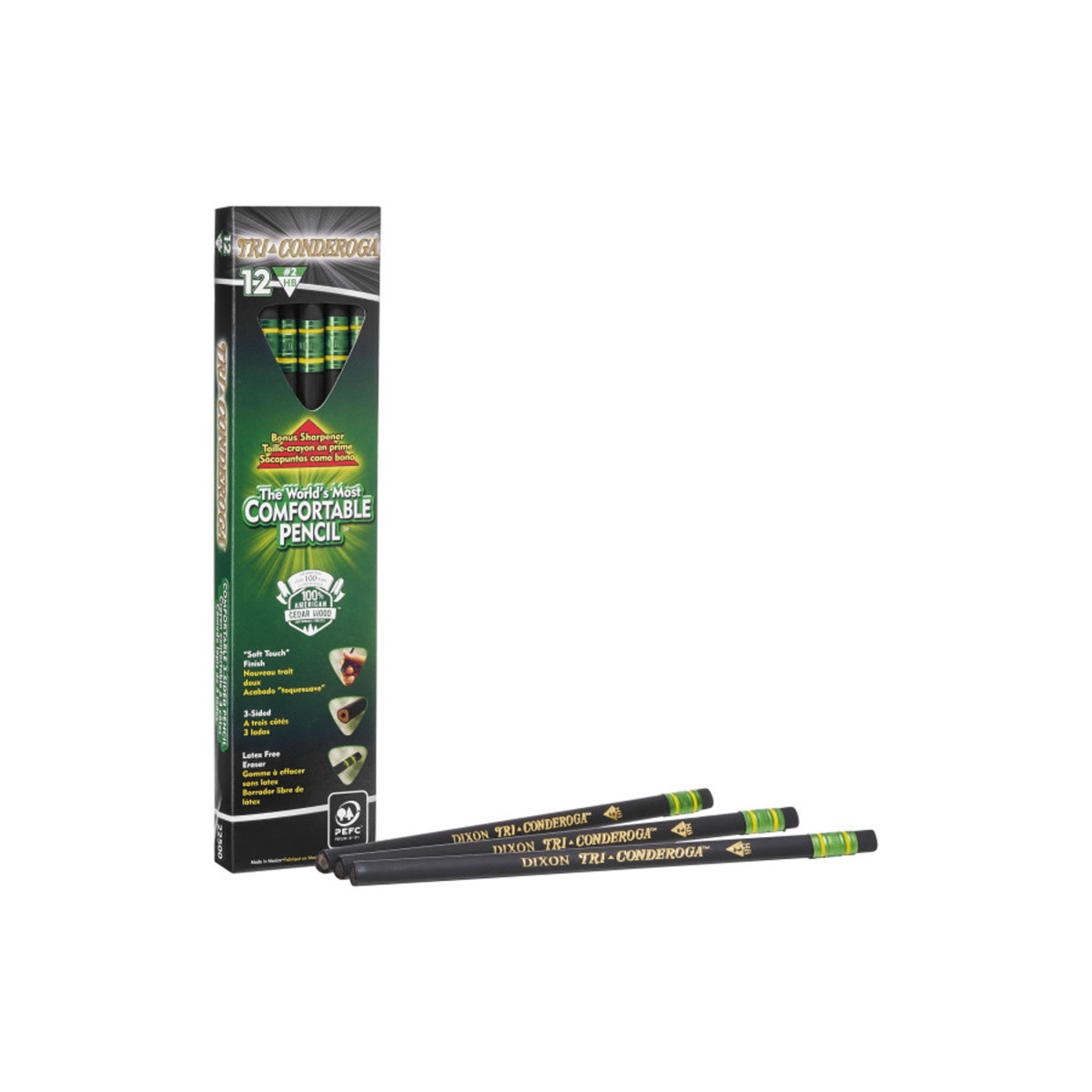 Tri-conderoga No. 2 pencil features a sleek, sophisticated, ergonomic design and Microban antimicrobial protection that lasts the lifetime of the product. Thicker diameter and unique "soft-touch" finish make the pencil more comfortable than the usual pencil. Triangular shape is designed for comfortable writing and keeps your fingers from cramping. Long-lasting, top quality, premium cedar wood allows easy sharpening with an exclusive graphite-core formula for smooth writing. Use quality eraser for clean smudge-free corrections. Pencil is PMA certified nontoxic. Each pack includes 12 pencils with bonus sharpener.