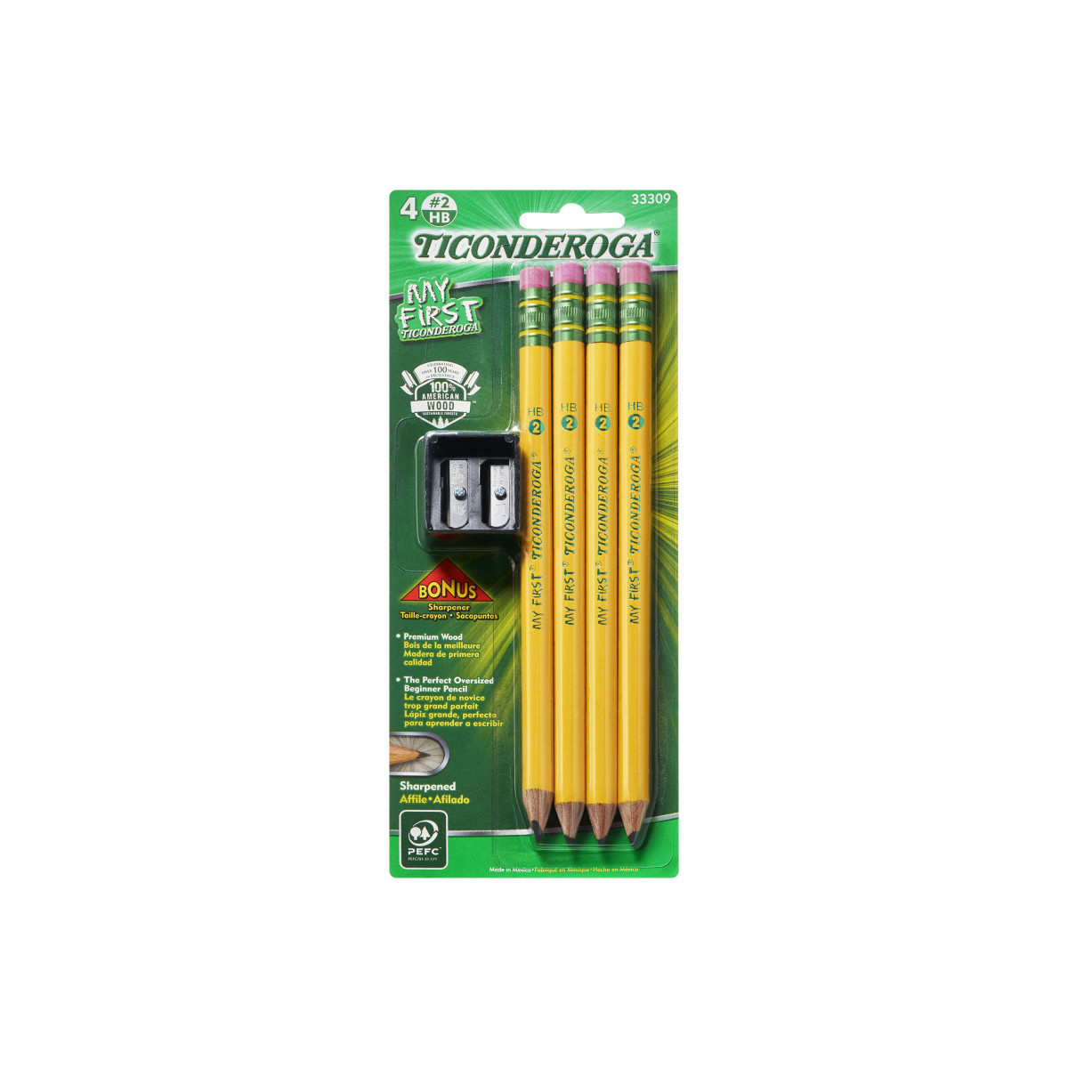 This large size (13/32") round No. 2 pencil is easy for small hands to hold making them ideal for children in the early stages of their writing development. The thick graphite core features a proprietary formula focusing on graphite mined from carefully controlled sources to deliver a broad smooth line. Pre-sharpened and includes bonus sharpener to save you time and hassle. Top-quality latex-free erasers remove marks completely without smudging. Premium wood harvested from responsibly managed sources provides smooth, even sharpening with minimal breakage. Teachers prefer Ticonderoga for its dependability and craftsmanship. When only the best will do, choose Ticonderoga brand pencils. Each pack includes 4 pencils.