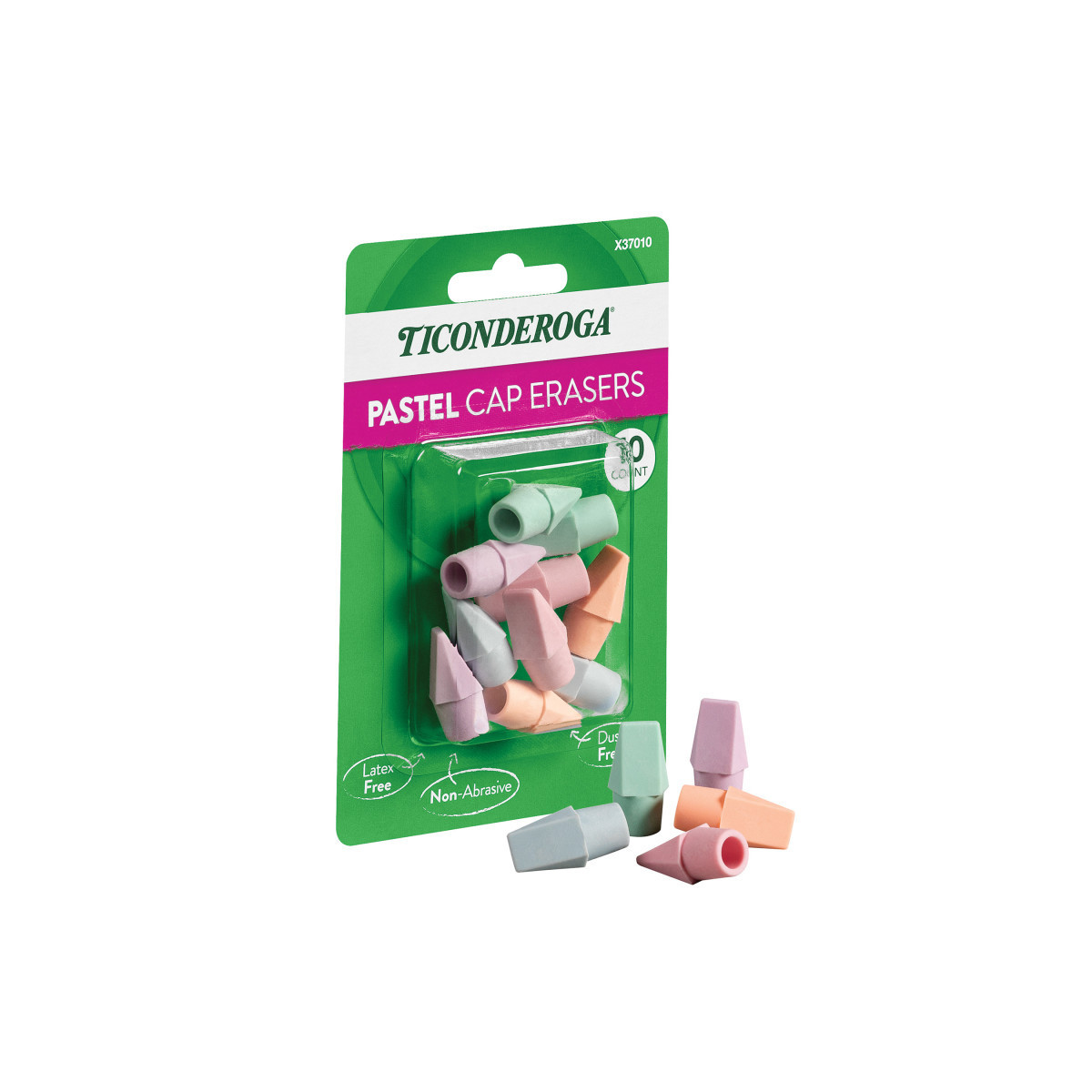 Ticonderoga® Pastel Erasers bring a little fun to your home, school or office, while still delivering the same great Ticonderoga® performance you expect. Beveled edges give you ultimate control over what you remove from the surface. These soft, latex-free pastel erasers cleanly remove black pencil marks, leaving you with a clear, smudge-free surface and minimal residue. PMA certified non-toxic. Each pack contains 10 pencil top erasers in 5 assorted pastel colors.