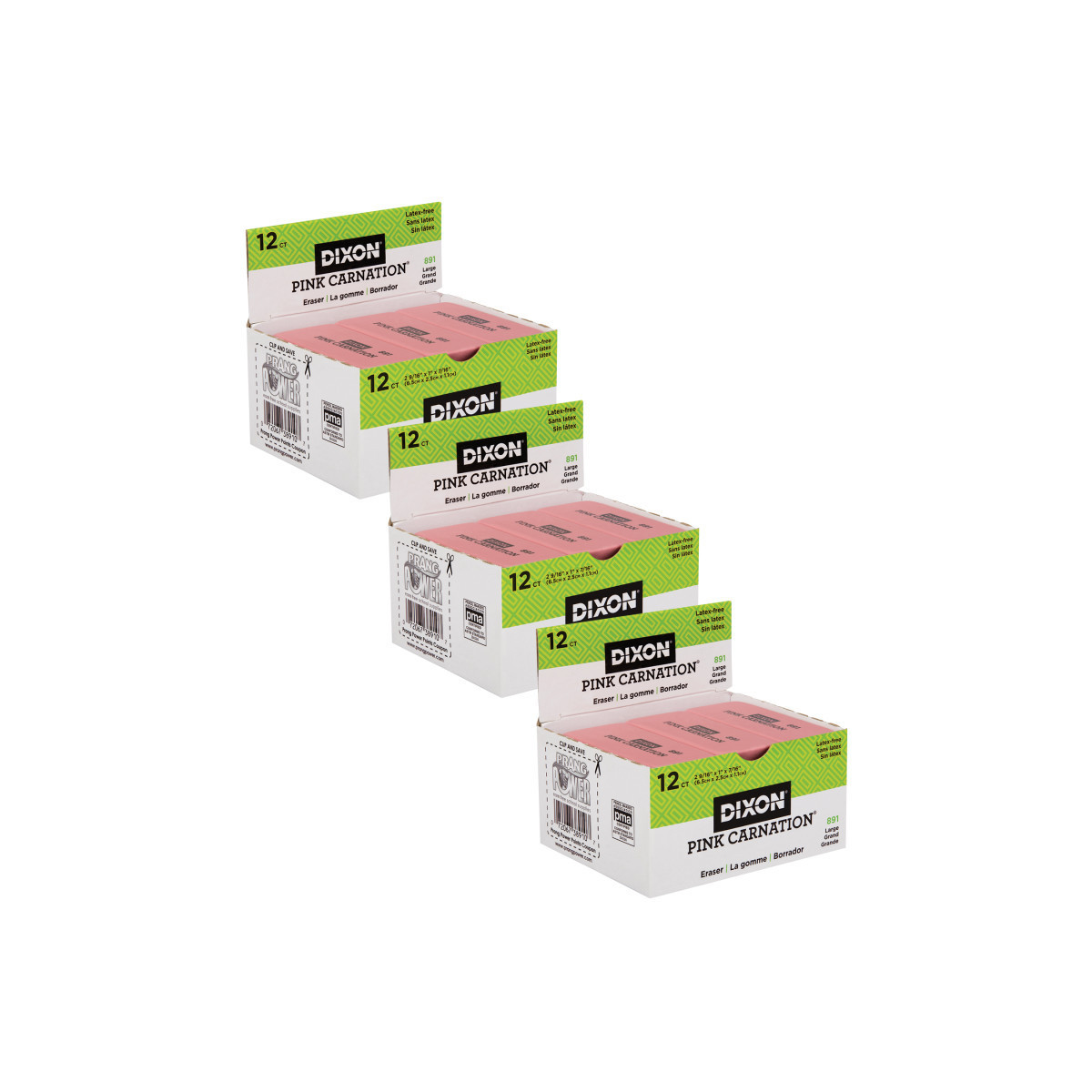 Pink Carnation Erasers by Dixon are the traditional office choice. Beveled edges give you more control over what you take off the page and what stays put. These soft, latex-free pink erasers cleanly remove black pencil marks, leaving you with a clear, smudge-free surface. PMA certified non-toxic. Erasers measure 2-9/16" x 1" x 7/16". Each pack includes 12 erasers. Sold as 3 packs for a total of 36 erasers.
