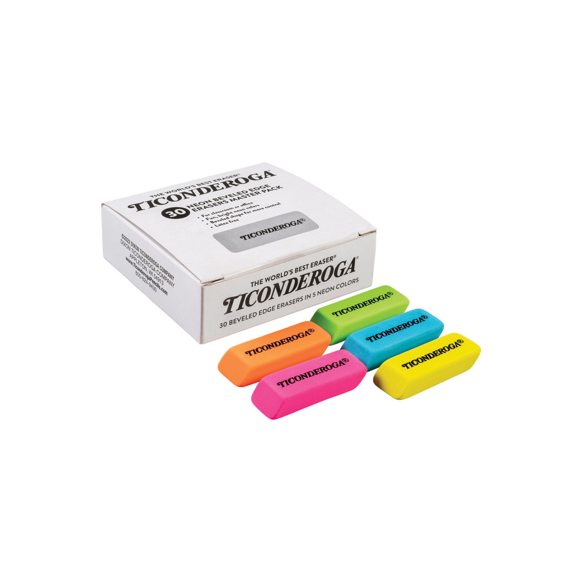 Ticonderoga Neon Erasers bring a little fun to your home, school or office, while still delivering the same great Ticonderoga performance you expect. Beveled edges give you ultimate control over what you remove from the surface. These soft, latex-free neon erasers cleanly remove black pencil marks, leaving you with a clear, smudge-free surface and minimal residue. PMA certified non-toxic. Easers measure 2-5/16" x 13/16" x 7/16". Each pack contains 30 medium size erasers in 5 assorted neon colors (pink, blue, orange green, and yellow).