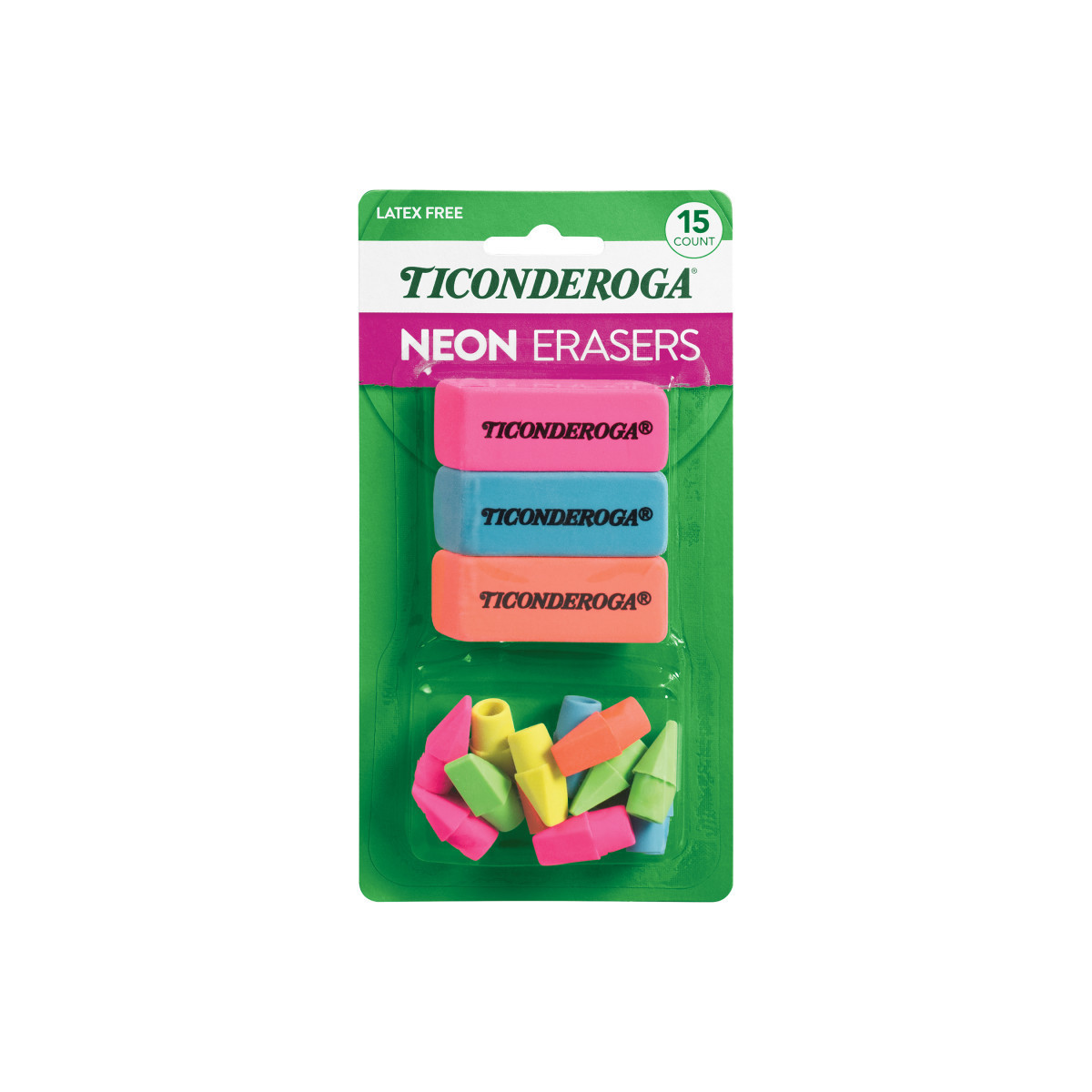 Dixon® Ticonderoga® Eraser combination set includes colorful erasers providing smudge-free corrections. The chisel shaped wedge cap eraser is made to fit over the end of any standard diameter pencil. Exceptional quality pliable pencil erasers feature smudge-free corrections every time. PMA approved non-toxic. Pliable pencil erasers feature smudge-free corrections every time. PMA approved non-toxic. Each set includes 3 beveled erasers and 12 wedge cap erasers all in fun bright colors.