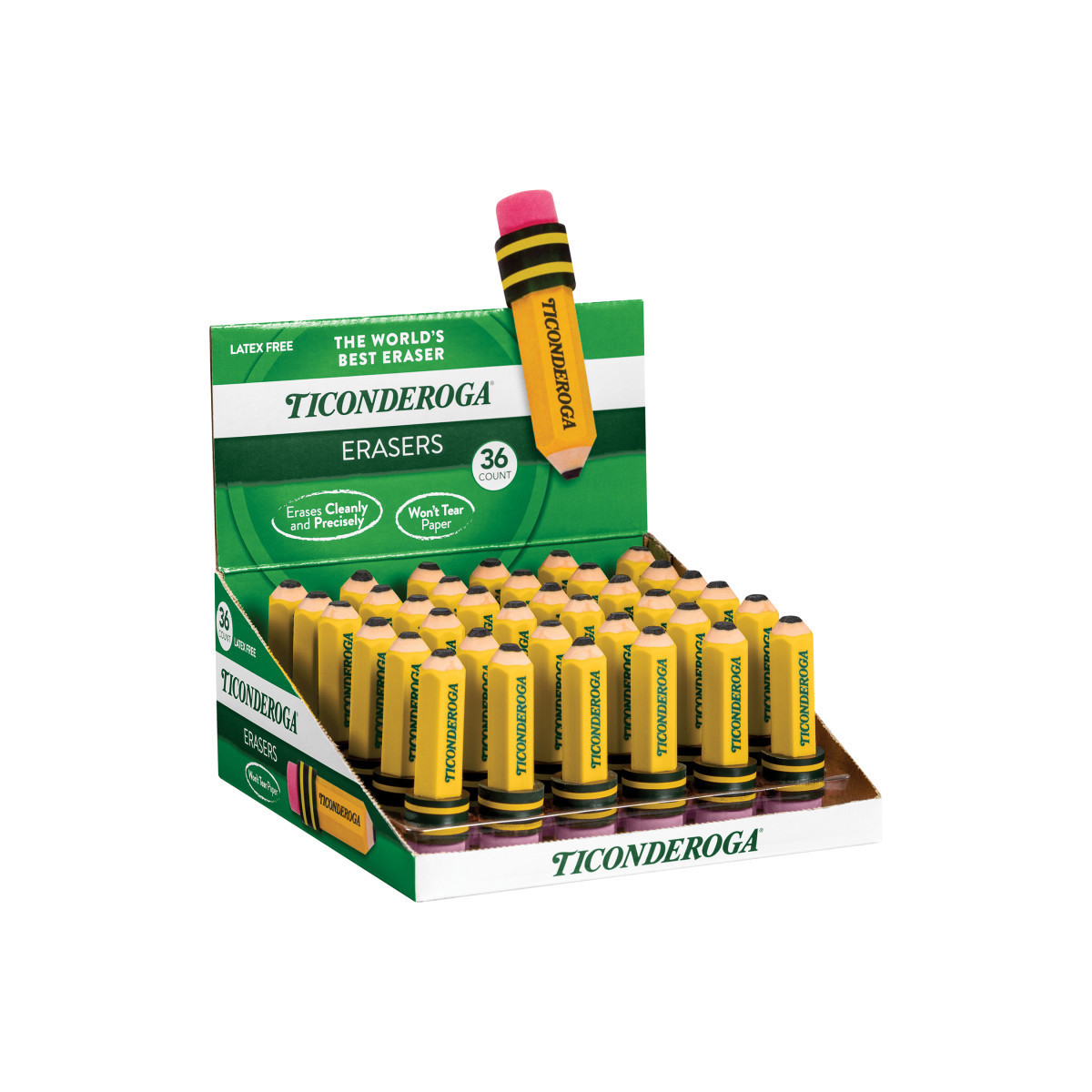 Ticonderoga®, the maker of The World's Best Pencils™, now brings you The World's Best Eraser! These erasers look like the famous Ticonderoga pencils and they erase like them too! The high quality latex-free erasers provide easy, clean corrections every time. Thirty-six erasers per box. PMA Certified non-toxic.