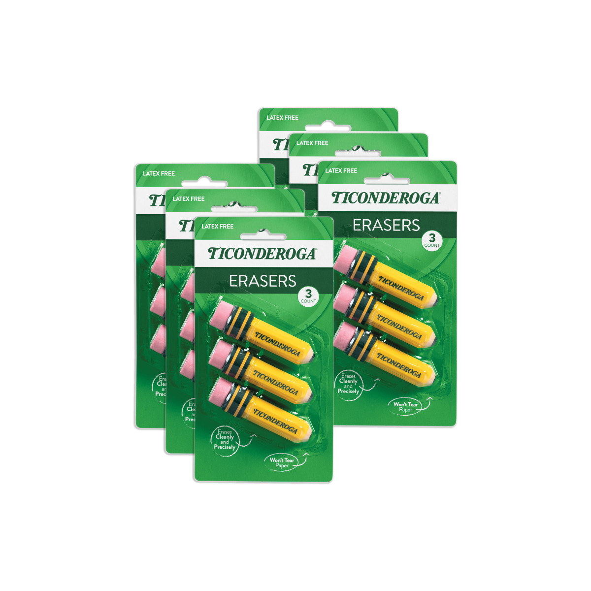 Ticonderoga® Erasers are the very best choice for home, school or office. These soft, latex-free erasers cleanly remove black pencil marks, leaving you with a clear, smudge-free surface and minimal residue. PMA certified non-toxic. Each pack includes 3 erasers. Sold as 6 packs for a total of 18 erasers.