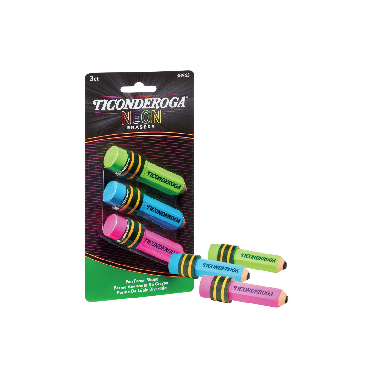 Ticonderoga® Pencil Shaped Neon Erasers, 3 Count