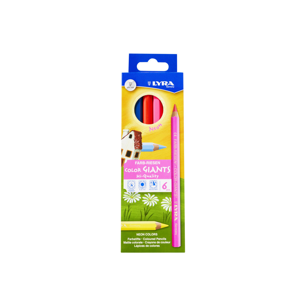 Lyra giant color pencils feature highly pigmented colors for bright, vivid intensity in all drawings or coloring. These pencils are hexagonal in shape with smooth, creamy 6.25mm lead. The lead is extra thick and very break resistant. Lead is encased in cedar wood. Pencils are great for all aspiring artists. Large hexagonal shape make them easy to hold. Each box includes 6 assorted neon colors. AP certified, non-toxic.