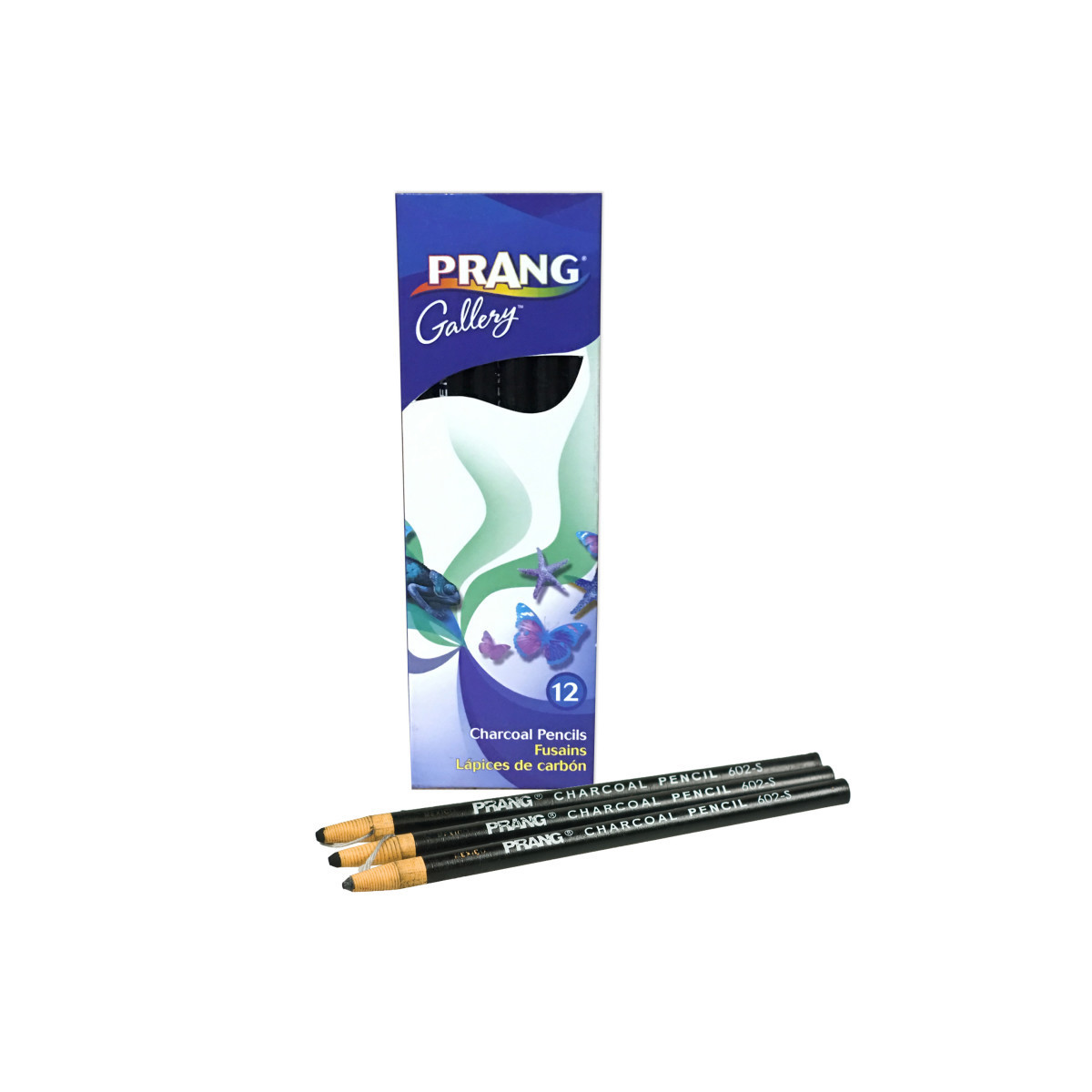 With Prang's paper wrapped charcoal pencils, pull the string to remove part of the paper and expose more charcoal - no sharpener needed. The charcoal comes in three grades: hard, medium or soft. Packed in dozen boxes. PMA certified non-toxic