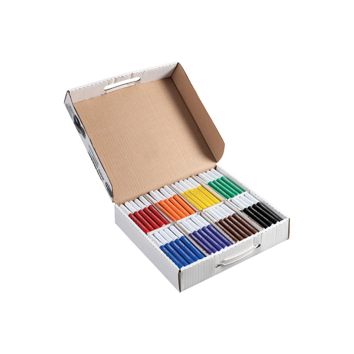 Prang® Washable Art Markers deliver bright colors without the mess. Washable formula easily washes off skin and most fabrics. Features a durable bullet tip for fine and broad lines. Inks won't bleed through and won't dry out even if the cap is left off for over 24 hours! Ventilated cap ensures safety. AP certified non-toxic. Conforms to ASTM standards. Includes 200 markers, 25 each of 8 colors.