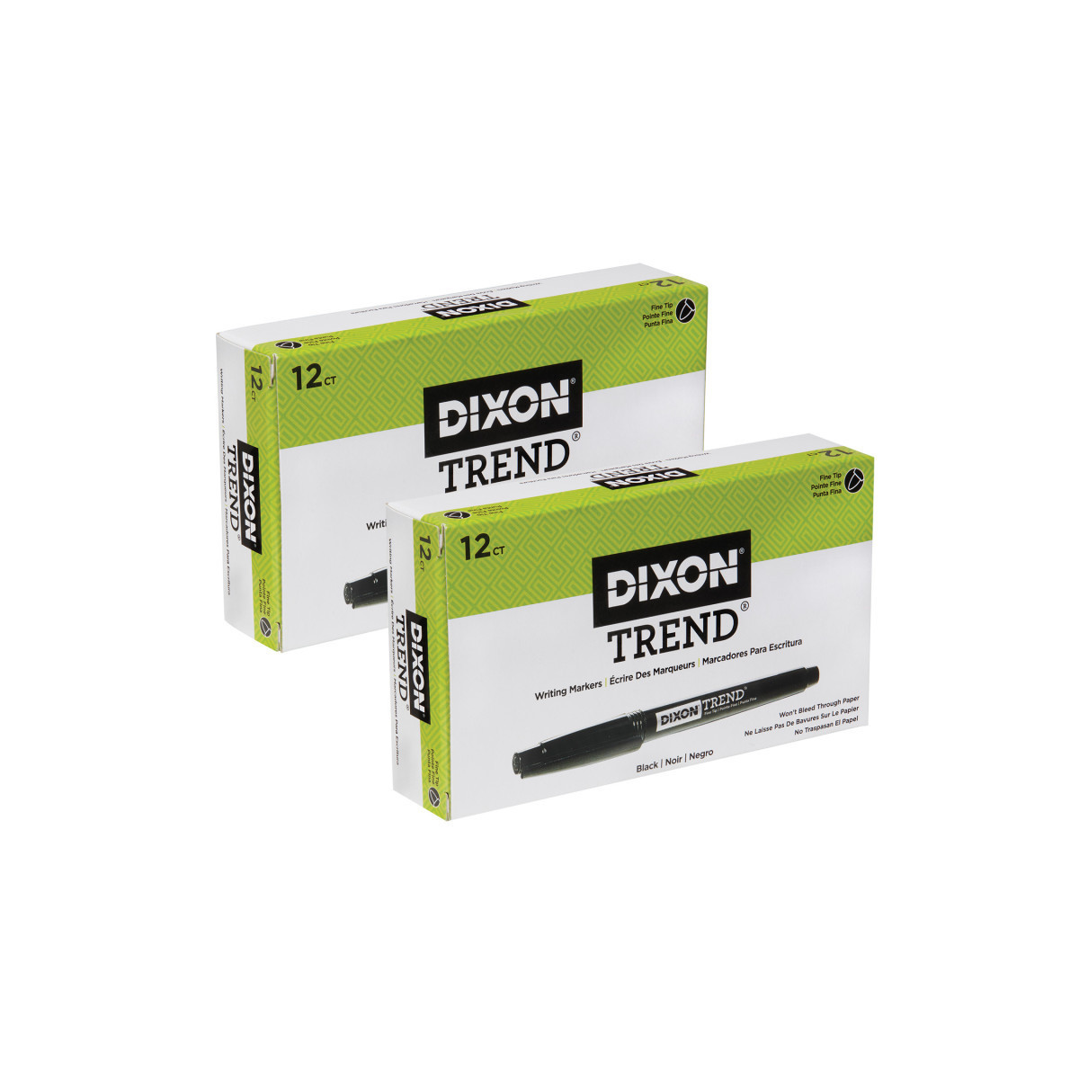 Dixon® Trend™ Synthetic Tip Pens have a durable fiber fine tip which allows for smooth writing. Ink is very low odor and will not bleed through paper. Non-toxic. Each box includes 12 pens with black ink. Sold as 2 boxes for a total of 24 pens.
