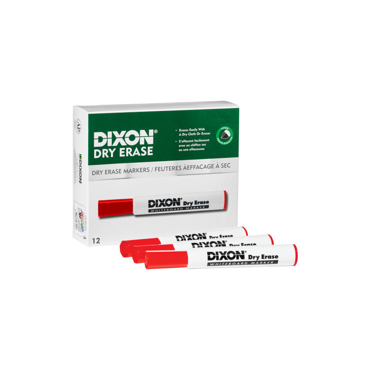 Dixon dry erase markers write on all types of whiteboards and non-porous surfaces, including glass. Opaque inks flow smoothly and evenly on the surface. They wipe away cleanly and easily with a cloth or eraser. Wedge tips provide a variety of strokes. Vented caps conform to small parts specifications. AP certified, non-toxic. Each pack includes 12 markers.