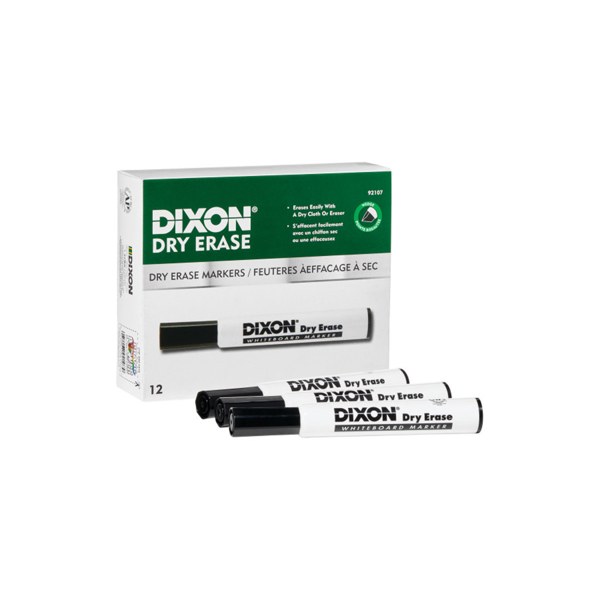 Dixon dry erase markers write on all types of whiteboards and non-porous surfaces, including glass. Opaque inks flow smoothly and evenly on the surface. They wipe away cleanly and easily with a cloth or eraser. Wedge tips provide a variety of strokes. Vented caps conform to small parts specifications. AP certified, non-toxic. Each pack includes 12 markers.