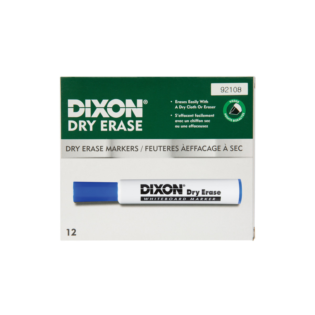 Dixon dry erase markers write on all types of whiteboards and non-porous surfaces, including glass. Opaque inks flow smoothly and evenly on the surface. They wipe away cleanly and easily with a cloth or eraser. Wedge tips provide a variety of strokes. Vented caps conform to small parts specifications. AP certified, non-toxic. Each pack includes 12 markers.