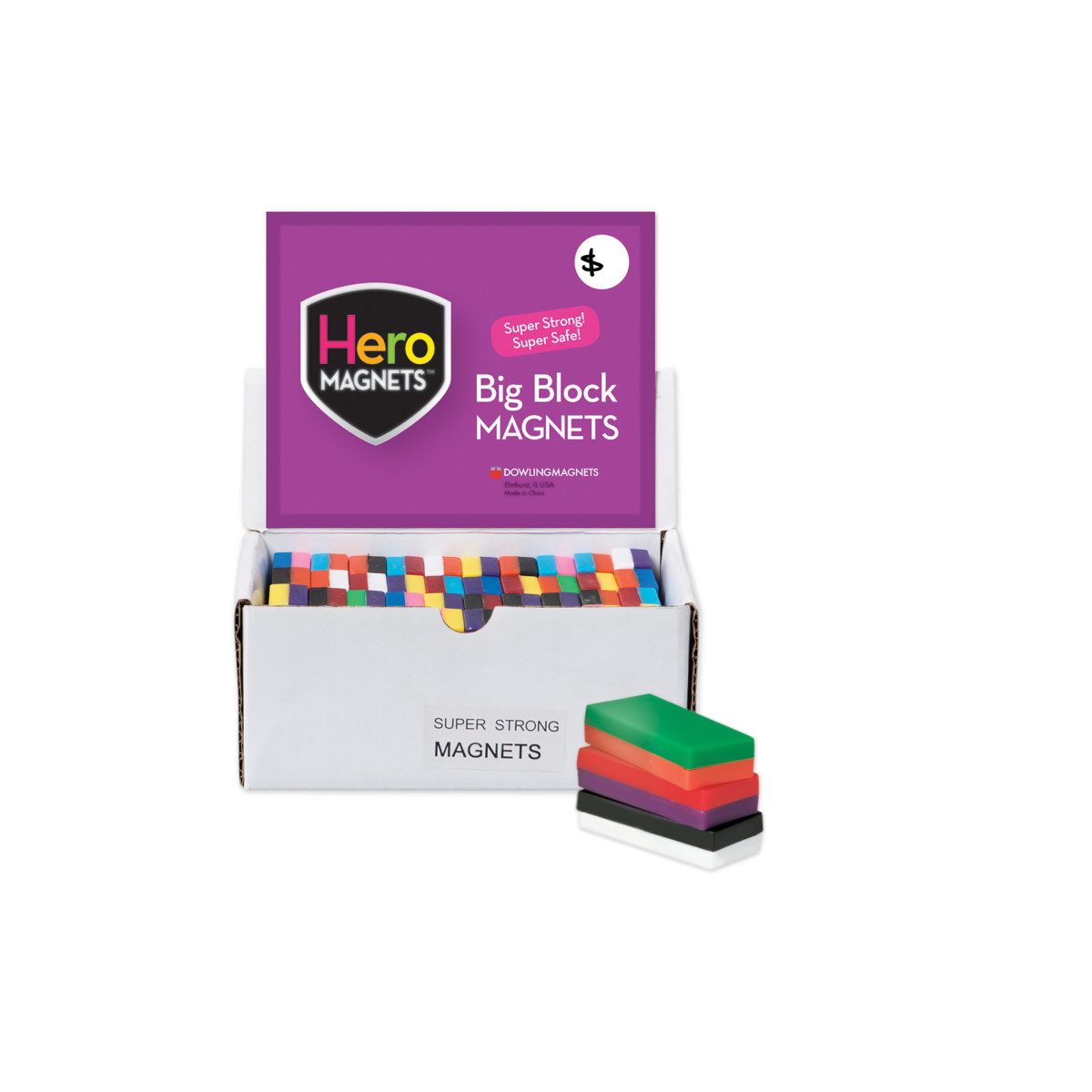 In search of safe magnets to use in the classroom or in a children's environment? Hero Magnets to the rescue! Chunky size with magnets completely encased in plastic. Strong display magnets help you get, and stay, organized. Great for whiteboards, filing cabinets, fridges, and more. Big Blocks measure 2"L x 1"W x 0.50"T and hold 20 pieces of paper. Flip them over to see a different bright color! Each set includes 40 magnets in a display box.