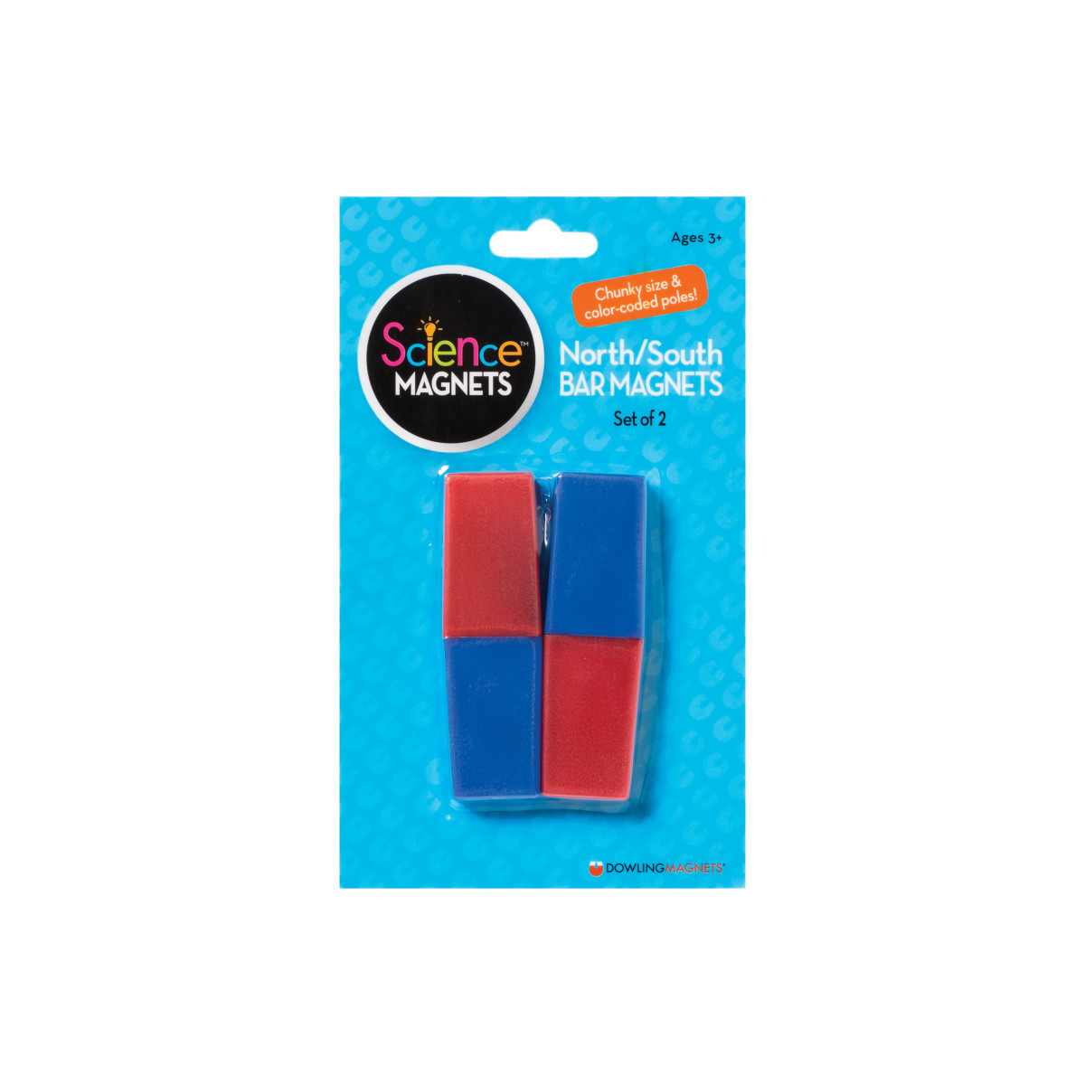 Sometimes simpler is better! Economical magnets in a basic bar shape feature an opposite pole on each end, creating an interesting arc-shaped magnetic field to explore. Ideal for activities that do not require a lot of lifting power. Learn all about magnetic polarity! Plastic encased ceramic magnets are color coded to indicate North and South poles. Each magnet measures 3.13"L x 1"W x .38"T. Each pack includes 2 bar magnets. For ages 3 and up.