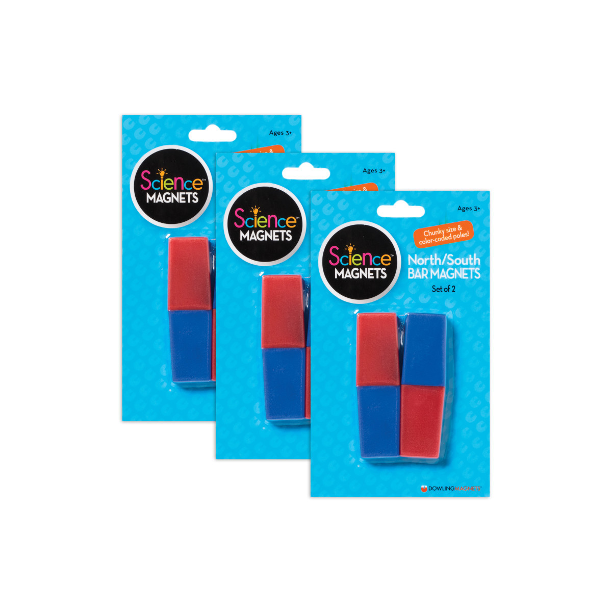 Sometimes simpler is better! Economical magnets in a basic bar shape feature an opposite pole on each end, creating an interesting arc-shaped magnetic field to explore. Ideal for activities that do not require a lot of lifting power. Learn all about magnetic polarity! Plastic encased ceramic magnets are color coded to indicate North and South poles. Each magnet measures 3.13"L x 1"W x .38"T. For ages 3 and up. Each pack includes 2 bar magnets. Sold as 3 packs for a total of 6 bar magnets.