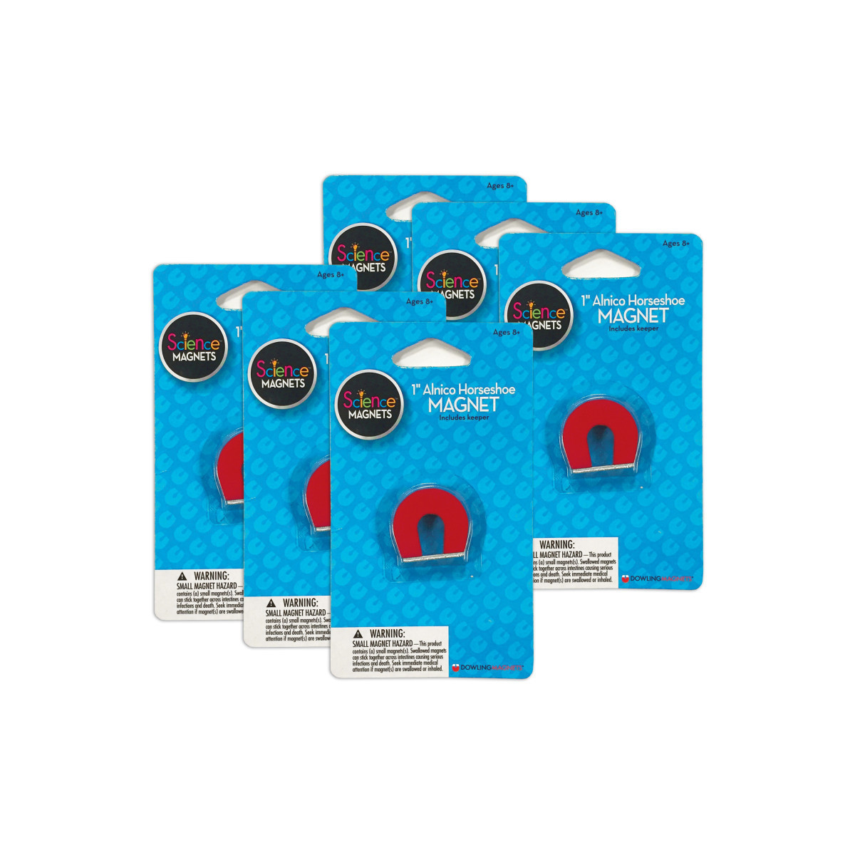Bend a bar magnet into a "U" shape, and what do you get? A stronger magnet! Why? Because the poles are side by side. Alnico magnets are strong and durable. Lift four pounds with a 1" tall alnico horseshoe magnet! Includes keeper. For ages 8+. Pack of 6 horseshoe magnets.
