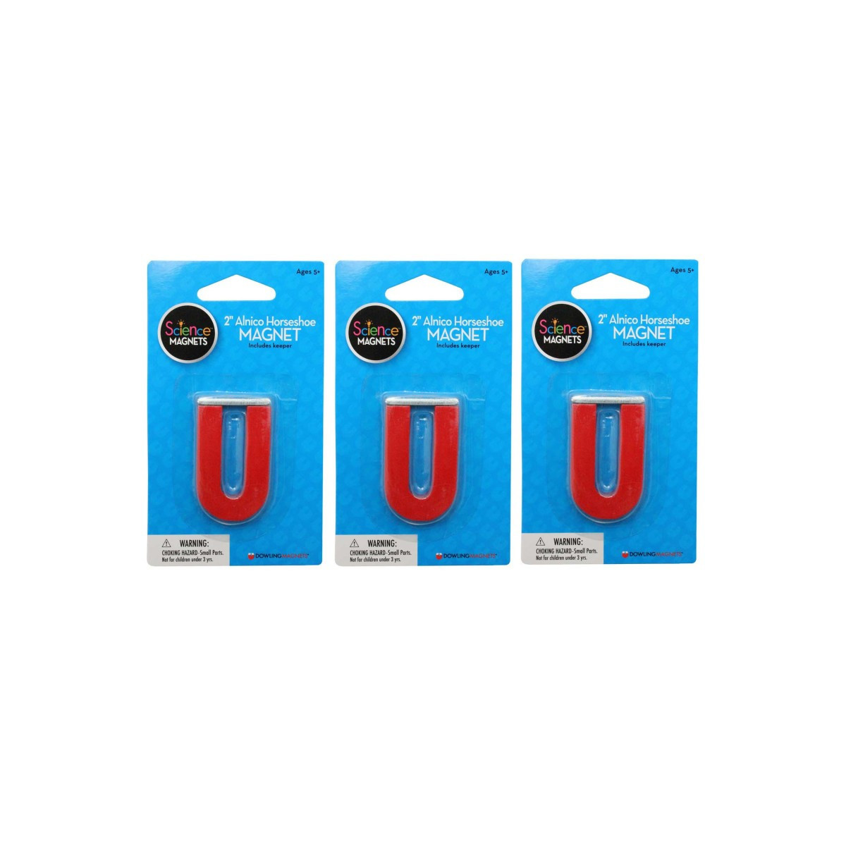 Bend a bar magnet into a "U" shape, and what do you get? A stronger magnet! Why? Because the poles are side by side. Alnico versions are strong and durable. Includes 2" tall alnico horseshoe magnet and keeper. For ages 8+. Sold as a pack of 3 horseshoe magnets.