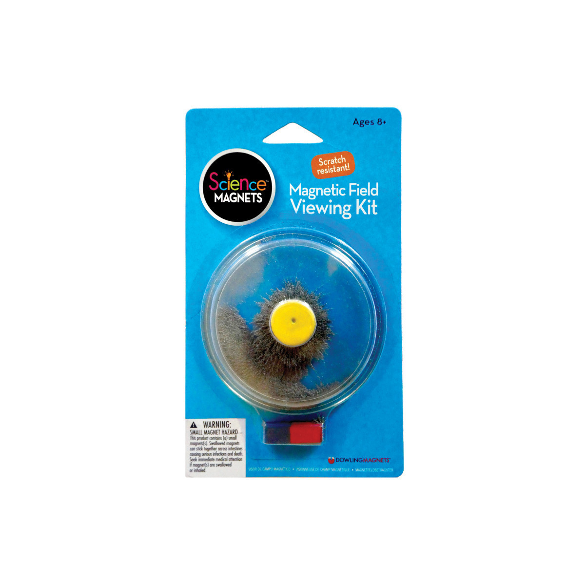 Stays clear! Steel filings are sealed in a scratch-resistant, transparent viewing tray. Includes rubber coated magnets (.75" disc magnet and 1" bar magnet) and filing-filled tray measuring 3.44" D.