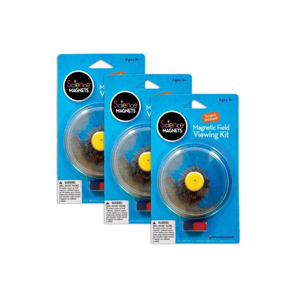 Mess-free! Steel filings are safely sealed in a scratch-resistant, transparent viewing tray for your investigations. Each kit includes rubber-coated magnets (0.75" disc magnet and 1" bar magnet) and filing-filled tray measuring 3.44"D. Sold as a pack of 3 kits. Ages 8+/Grades.