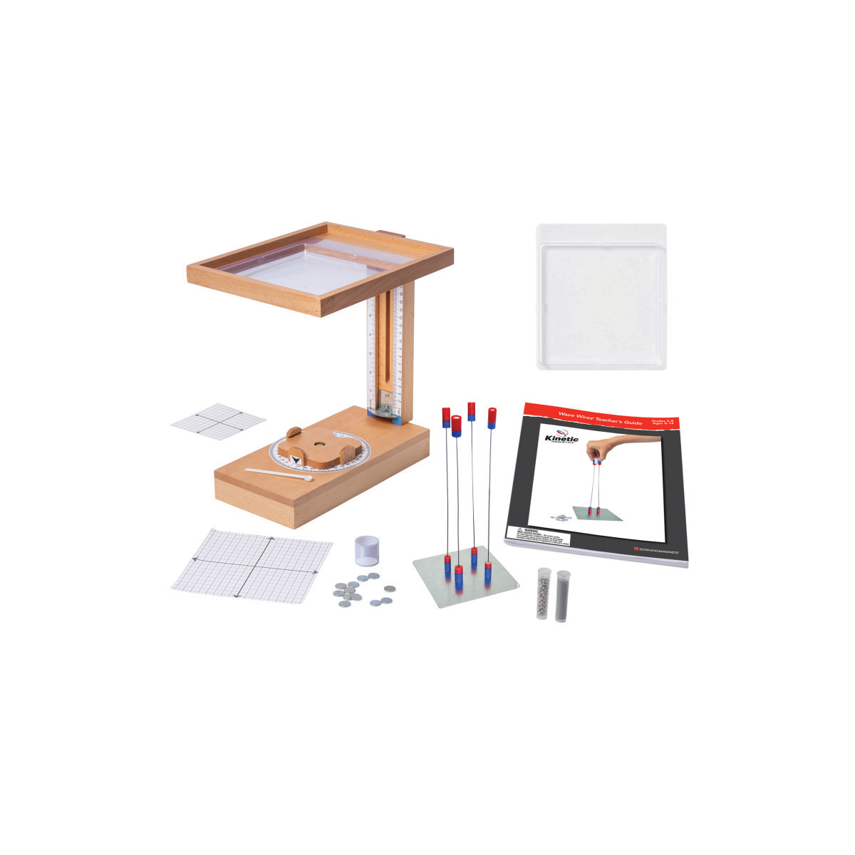 Includes enough materials for teacher demonstration or a small group: wood station with turntable, 2 viewing trays with graph inserts, 4 magnet wave wires, 1 station base, 12 steel weights, 1 activation rings, tube of iron filings, tube of steel balls, measuring spoon, and 40-page booklet.