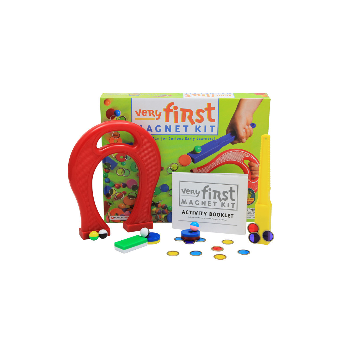 Inspires next generation scientists! Amazes early learners as they observe and investigate magnetism for the first time. Explore magnetic versus non-magnetic objects, play magnet games and discover if a magnetic force travels through water, cardboard or the sides of a glass jar. Very First Magnet Kit includes: 1 magnet wand, 1 giant horseshoe magnet, 10 magnet marbles, 20 counting chips, 3 ring magnets, 2 plastic-encased button magnets, 1 plastic-encased block magnet, and a complete activity booklet with translations in German, French and Spanish.