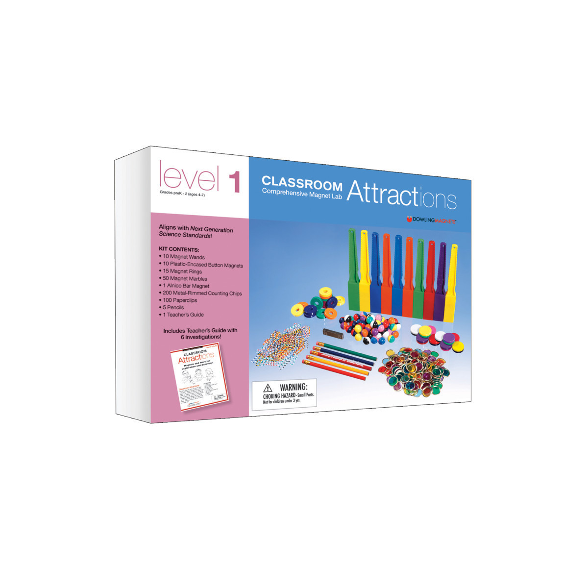 This classroom kit contains: 5 pencils, 5 button magnets, 10 disc magnets, 10 Magnet Wands, 15 ring magnets, 50 magnet marbles, 100 colored paper clips, 200 magnetic counting chips, demo bar magnet, teacher activity guide