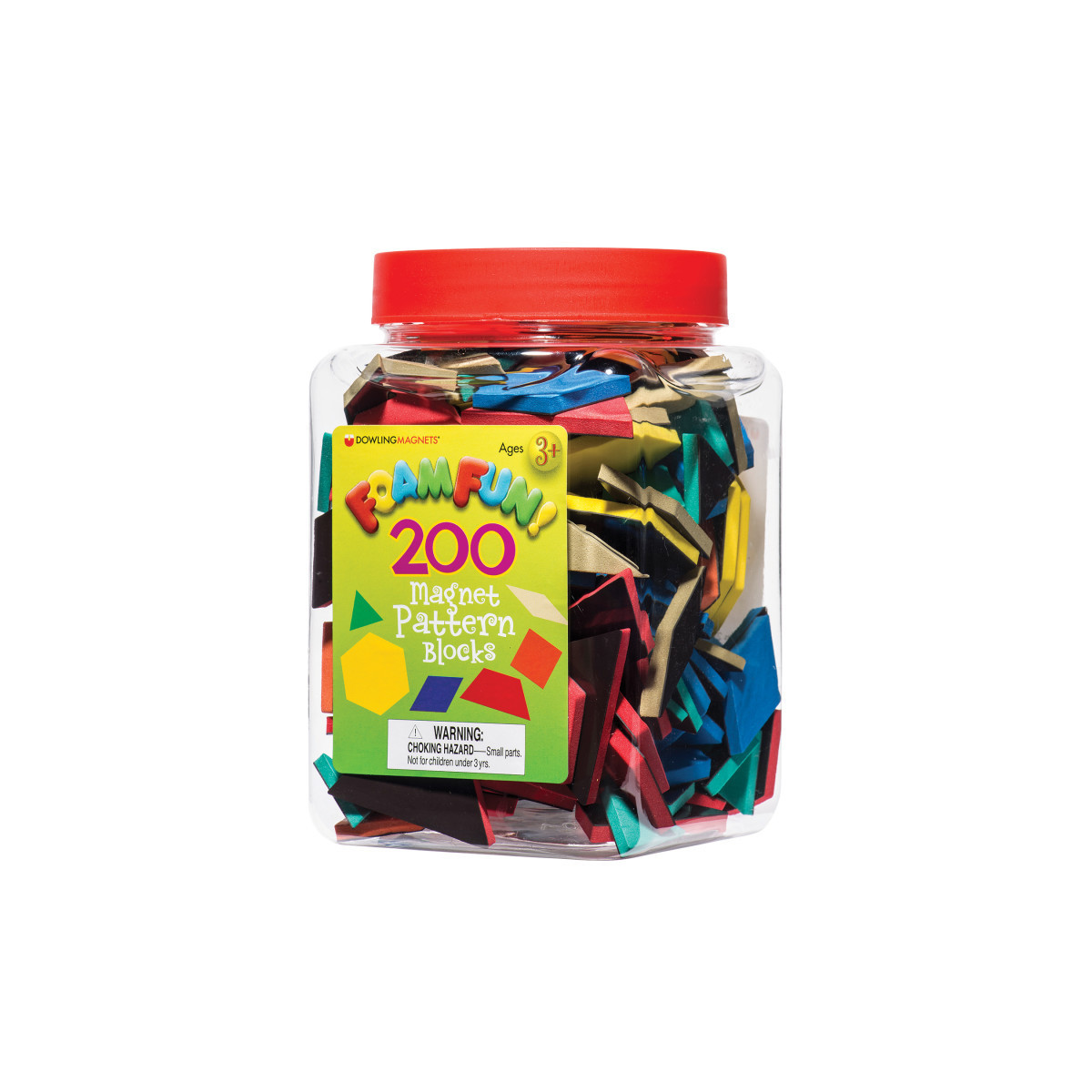 Chunky, soft foam shapes are easy for little hands to pick up. Ideal for identifying, describing and comparing 2-D shapes...plus much more. Includes 200 magnetic pieces (6 shapes and colors) 20 yellow hexagons, 20 orange squares, 40 green triangles, 40 red trapezoids, 40 blue parallelograms/rhombi, 40 tan parallelograms/rhombi, and activity booklet in a storage bucket. Measure .21"T each. Ages 3+/Grades PreK+.
