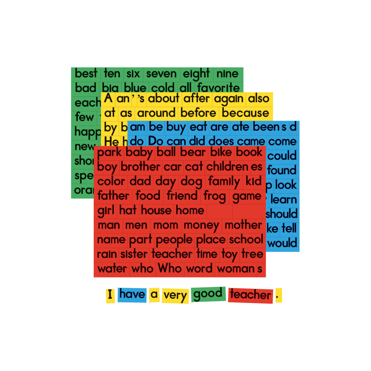 Set includes 51 Red Nouns, 78 Blue Verbs, 51 Green Adjectives and 112 Yellow adverbs, articles, conjunctions, prepositions, pronouns and punctuation marks