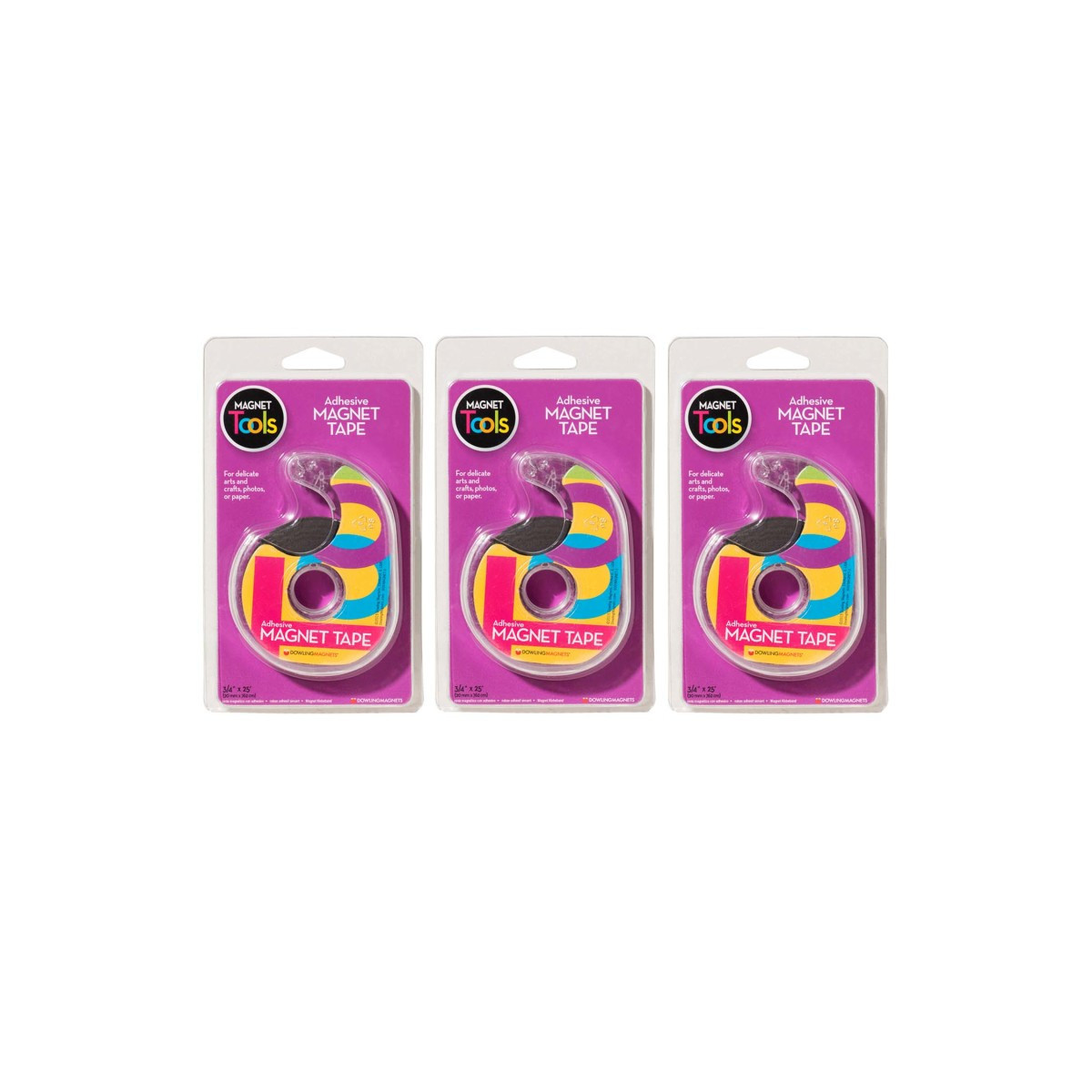 Flexible and extra thin--no added bulk! Features light adhesive and light magnet holding power. For delicate arts and crafts projects or hanging paper or photos. 25-foot roll of extra thin magnet strip with adhesive backing. Just pull off what's needed and tear easily on serrated edge of dispenser! Measures 0.75"W x 25'L per roll. Sold as a pack of 3 rolls.