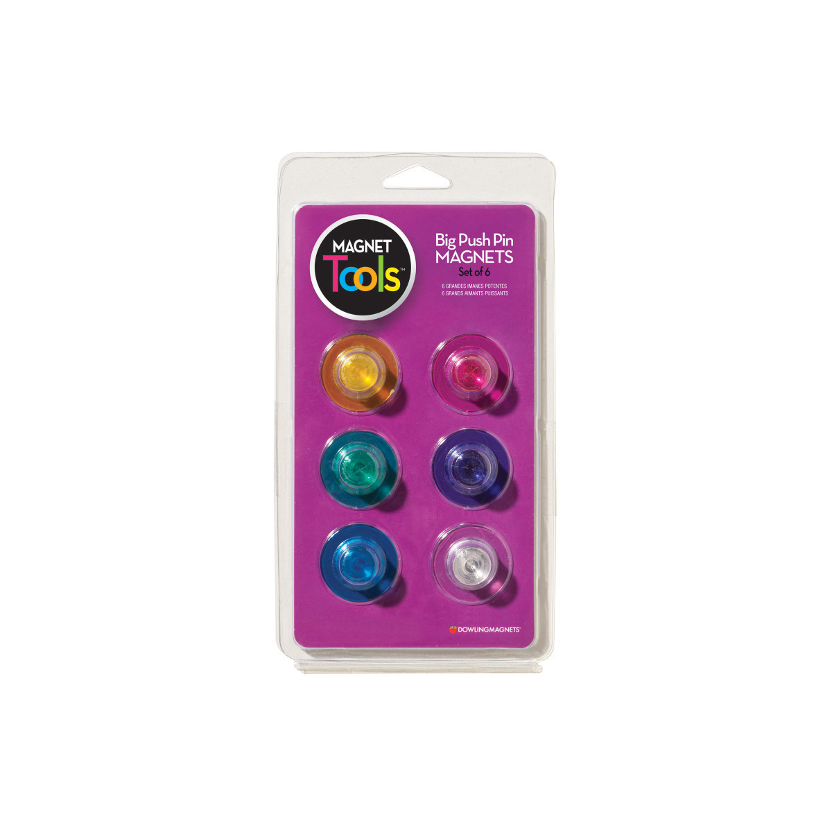 High-powered rare earth magnets are completely encased in plastic. Great for whiteboards, filing cabinets, fridges and more. Over-sized mean they're easy to grab and hard to lose! Each holds up to 10 pieces of copy paper! They are strong but won't pinch fingers! Each magnet measures 0.8"H x 1.3"D. Set of 6 (clear, pink, yellow, green, blue, purple).