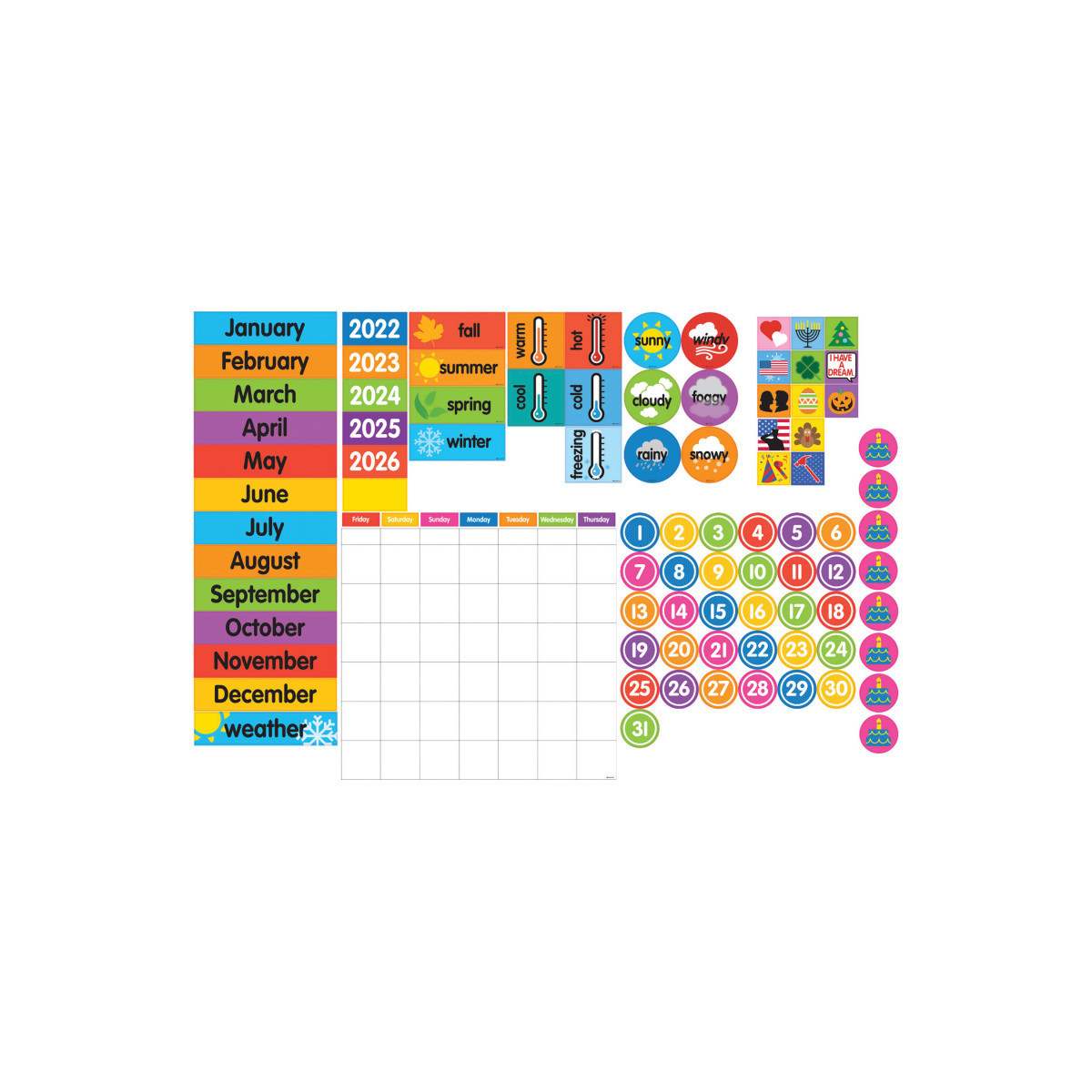 Bright, contemporary calendar attracts directly to your whiteboard—large and easy to see! Great for daily calendar activities every morning. Month grid is dry-erasable and measures 17.5"W x 16"H.