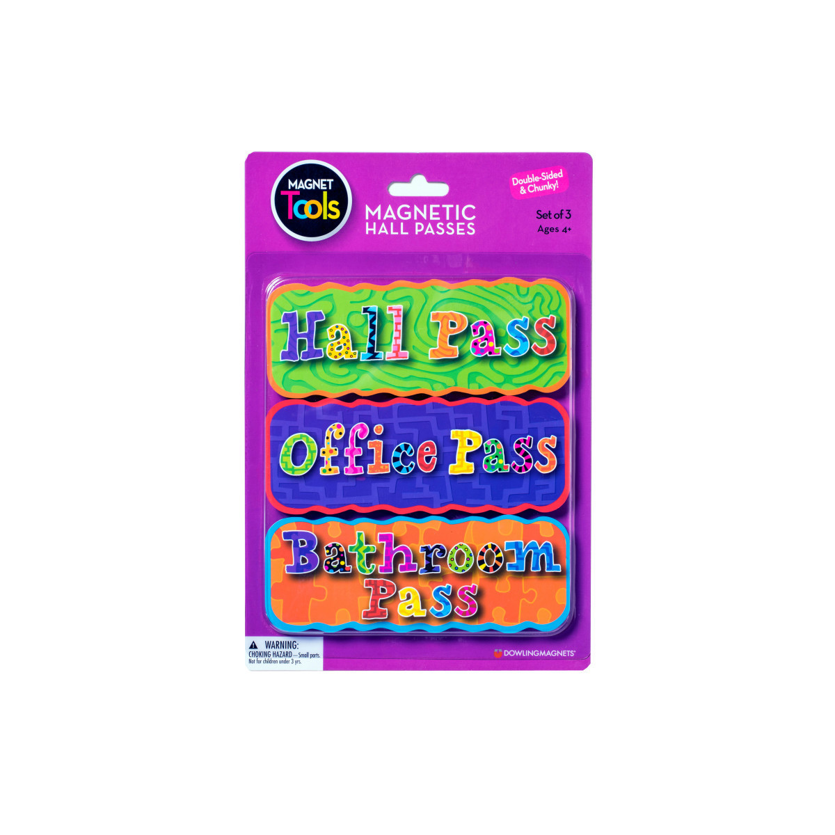 Say goodbye to flimsy hall passes that students lose! Chunky foam core makes these passes less "forgettable." Double-sided magnetic to store on your whiteboard, filing cabinet or door frame until called into action. Includes 3 passes: hall, office and bathroom. Passes measure 6" L x 2.25" W x 0.25" T each.