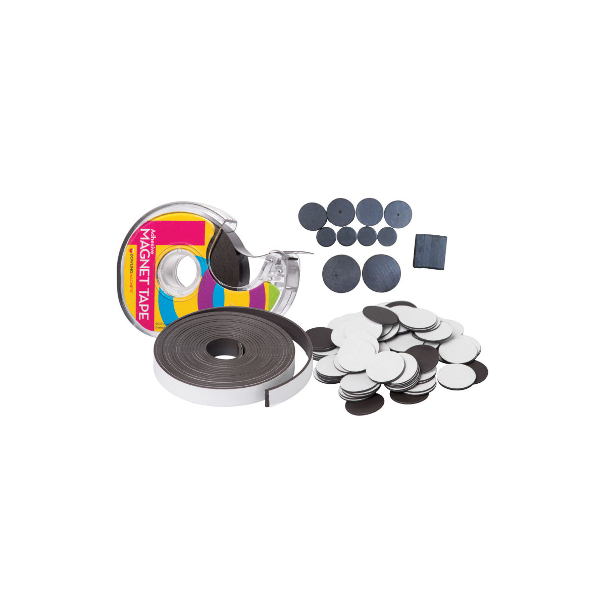 Magnetic Arts & Crafts Bundle includes a variety of magnets for a wide range of craft and hobby projects! Includes 1 roll of Magnet Tape in Dispenser (.75" x 25') for delicate art and photo projects; 100 individual Magnet Adhesive Dots (.75"D) for your photos, cardstock, or thin foam; 1 roll of Adhesive Magnet Strip (1"W x 10'L) for your thicker cardstock and thin plastic objects, and 14 unfinished ceramic magnets (10 discs from .50"-1"D and 4 small bar magnets) for heavier projects. Ceramic magnets require your adhesive.
