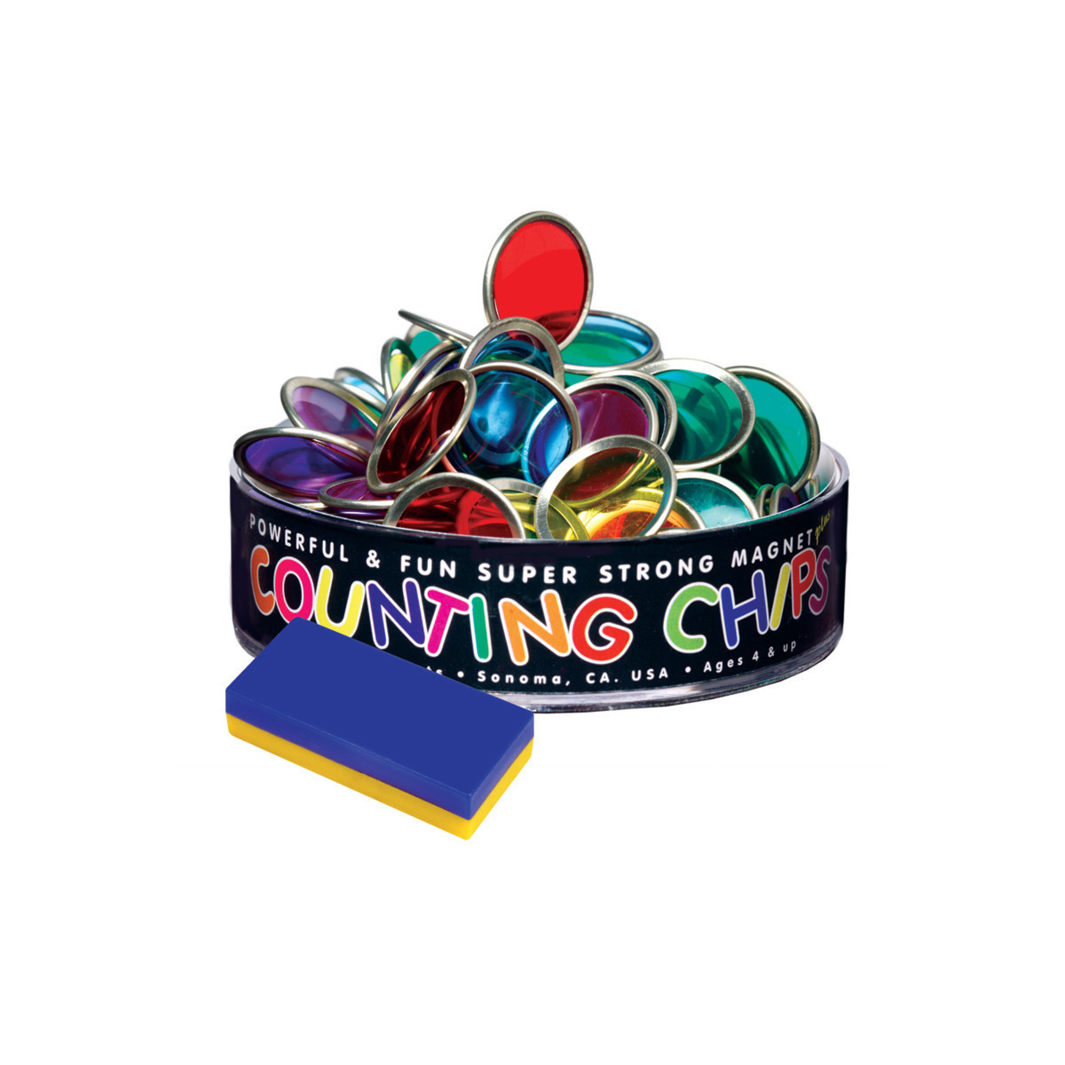 Experiment, count, and sort with our counting chips and block magnet. Counting chips are 7/8"; round and have metal edges to attract to the 2 x 1 x 1/2" block magnet. Assorted colors.