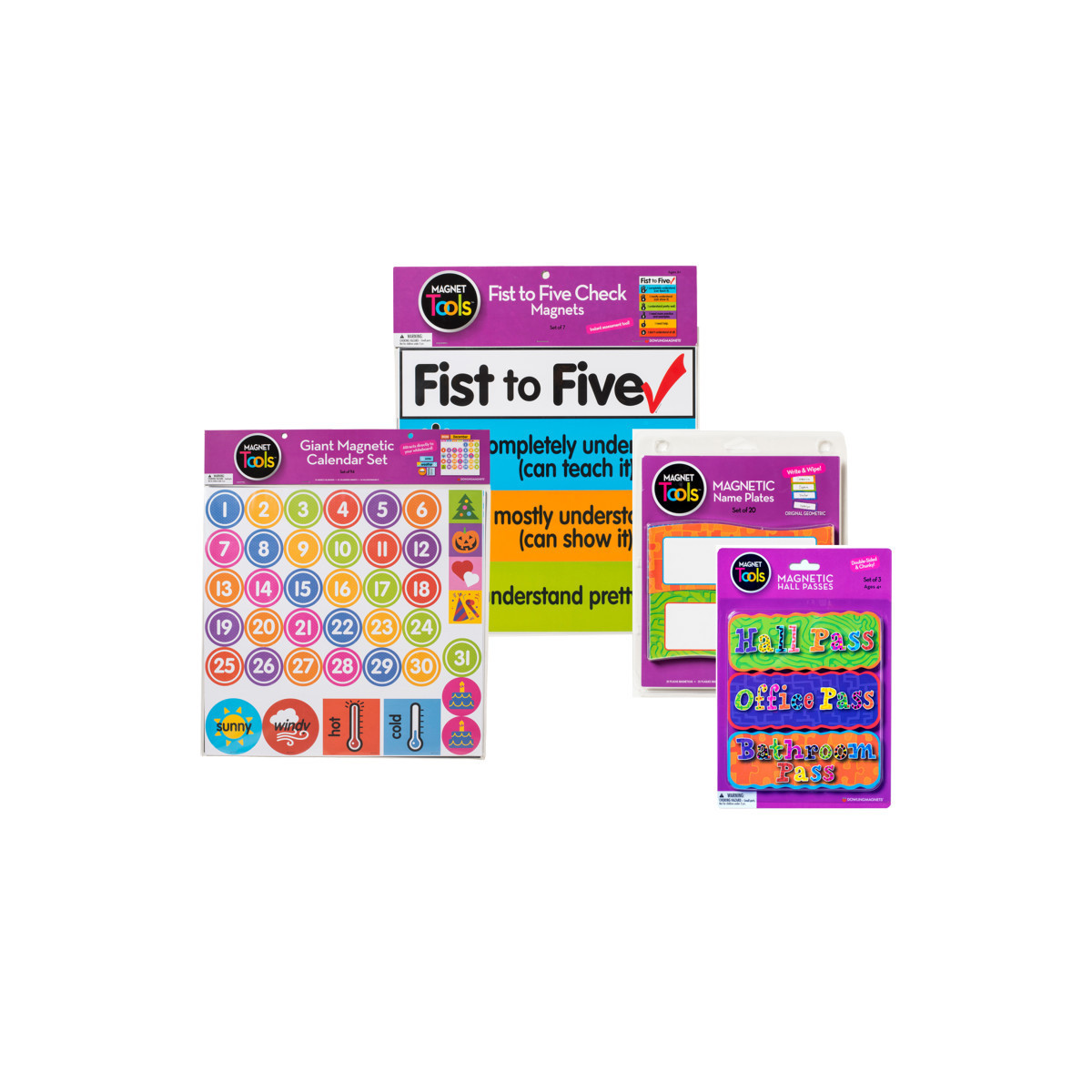 Transform your classroom into an organized and interactive learning space with our comprehensive Classroom Management Magnets Bundle. This all-in-one kit features a bright, contemporary Giant Magnetic Calendar Set that adheres directly to your whiteboard, perfect for daily calendar activities. The set includes a dry-erase, 17.5"W x 16"H calendar grid, along with magnets for years, seasons, months, days, dates, birthdays, holidays, weather symbols, and temperature symbols. Additionally, the kit includes a set of three durable Magnetic Hall Passes with a chunky foam core to prevent loss, easily attachable to any magnetic surface. The Magnetic Name Plates, set of 20 in four different colors and a unique nested shape, are perfect for organizing seating charts, work groups, and more.