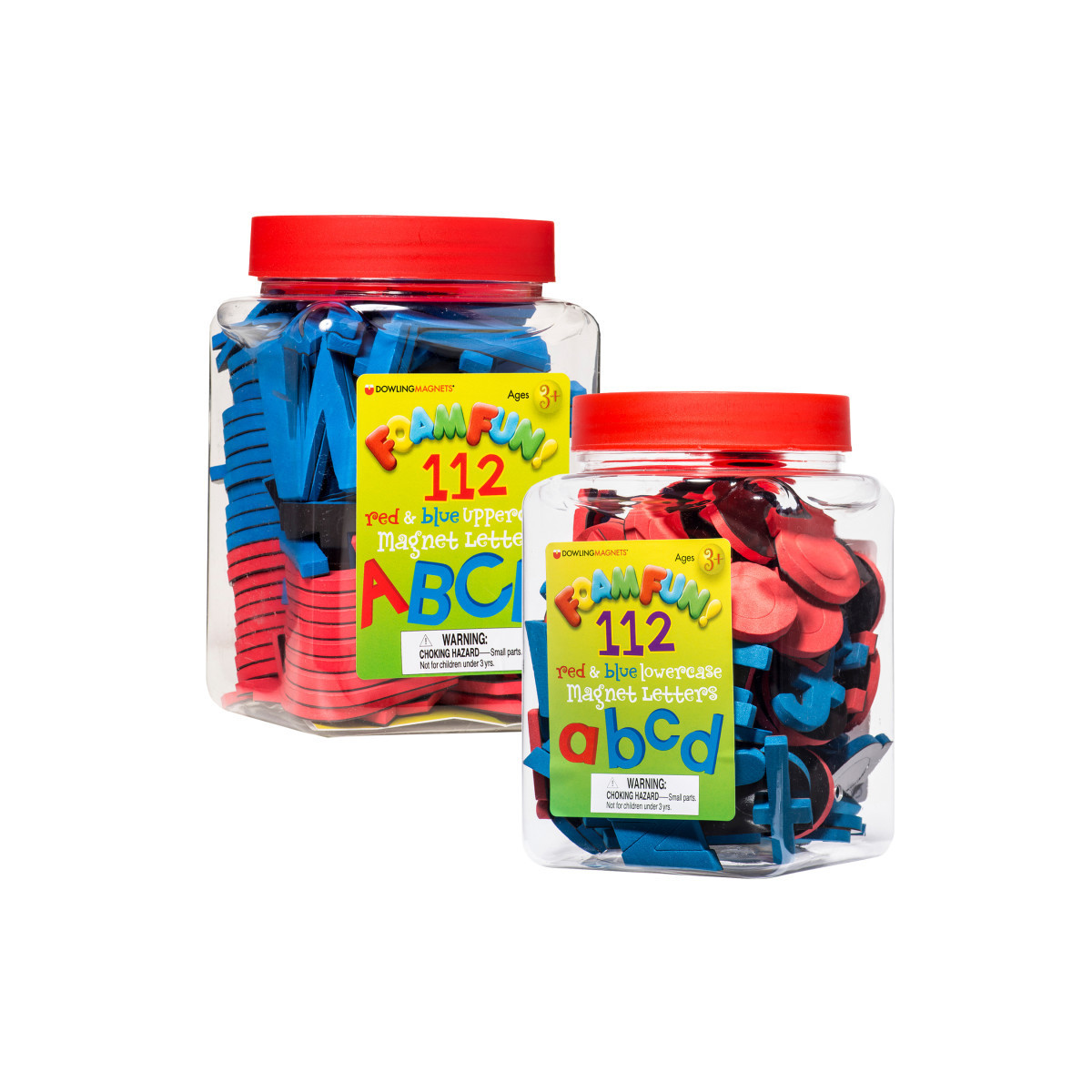 Foam Fun Magnet Letters Red & Blue Bundle is made for little fingers! Includes 1 set each of uppercase and lowercase letters, each set with a storage container. Flexible foam is chunky and easy to handle. Perfect for identification, phonics, and word building/spelling activities. Red and Blue sets are color coded to help kids differentiate vowels from consonants. Each letter measures 1"-2" tall. Includes 112 magnetic letters and storage container. In the red and blue Foam Fun letter sets, "y" and "w" are included in both red (vowel) and blue (consonant) colors since these letters also can be vowels (diphthongs: "ew," "ow," " ay," "oy," and more). Includes 1 uppercase set and 1 lowercase set for a total of 224 letters, each individual set includes 112 Foam Fun Magnet Letters: 49 red: 9 each vowel, 2 "y" & 2 "w", 63 blue: 3 each consonant (including "y" & "w").